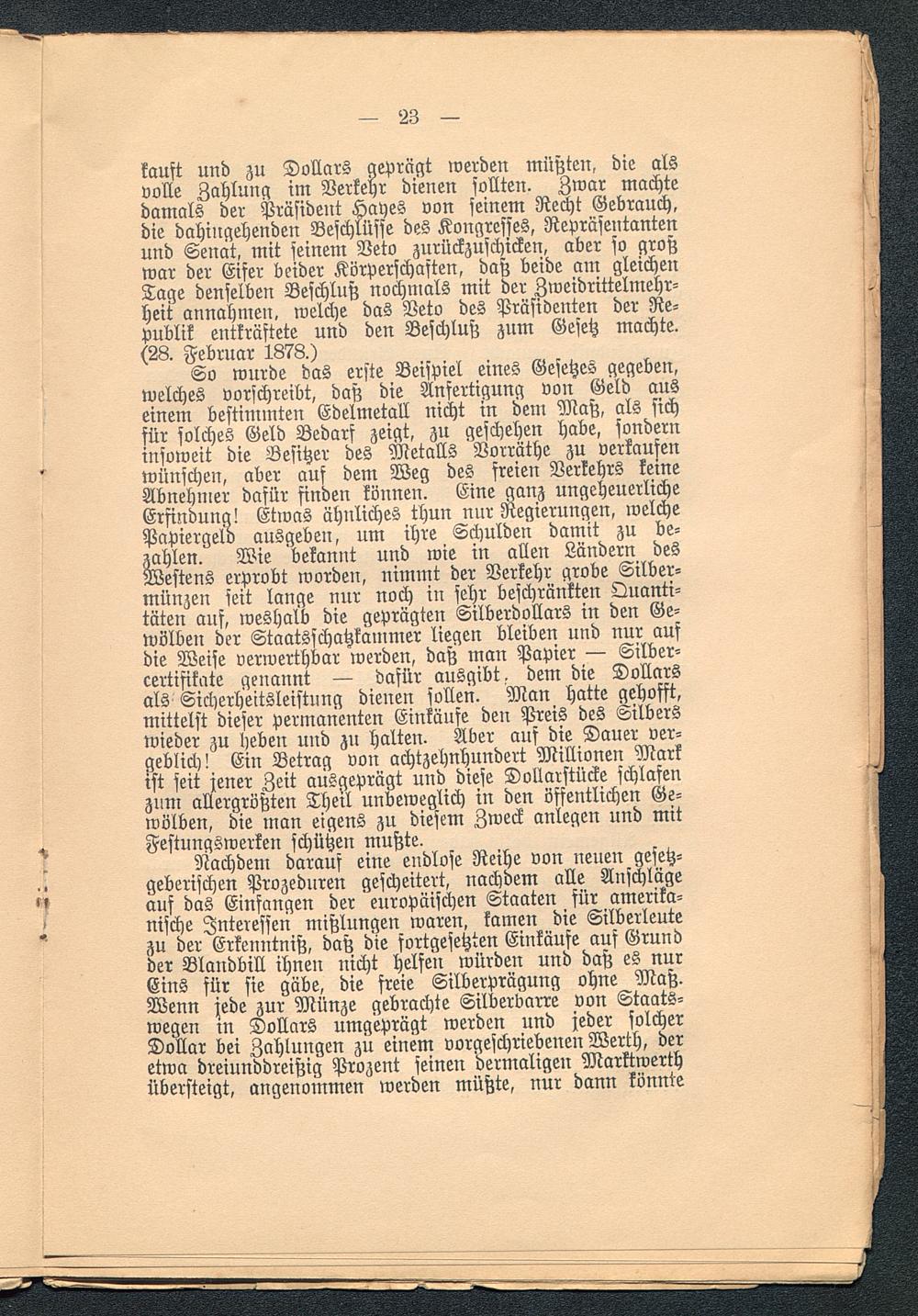 kaust und zu Dollars geprägt werden müßten, die alsvolle Zahlung im Verkehr dienen sollten. Zwar machtedamals der Präsident Hayes von seinem Recht Gebrauch,die dahingehenden Beschlüsse des Kongresses, Repräsentantenund Senat, mit seinem Veto zurückzuschicken, aber so großwar der Eifer beider Körperschaften, daß beide am gleichenTage denselben Beschluß nochmals mit der Zweidrittelmehr-heit annahmen, welche das Veto des Präsidenten der Re-publik entkräftete und den Beschluß zum Gesetz machte.(28. Februar 1878.)
