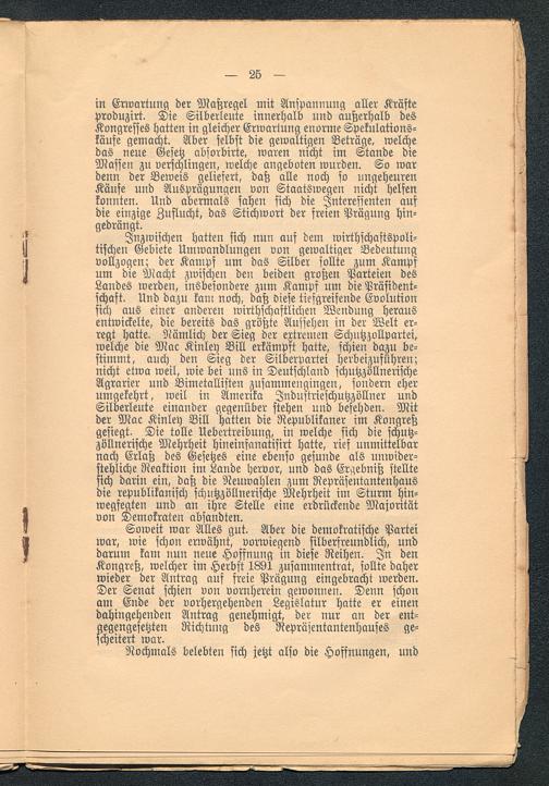Soweit war Alles gut. Aber die demokratische Parteiwar, wie schon erwähnt, vorwiegend silberfreundlich, unddarum kam nun neue Hoffnung in diese Reihen. In denKongreß, welcher im Herbst 1891 zusammentrat, sollte daherwieder der Antrag auf freie Prägung eingebracht werden.Der Senat schien von vornherein gewonnen. Denn schonam Ende der vorhergehenden Legislatur hatte er einendahingehenden Antrag genehmigt, der nur an der ent-gegengesetzten Richtung des Repräsentantenhauses ge-scheitert war.