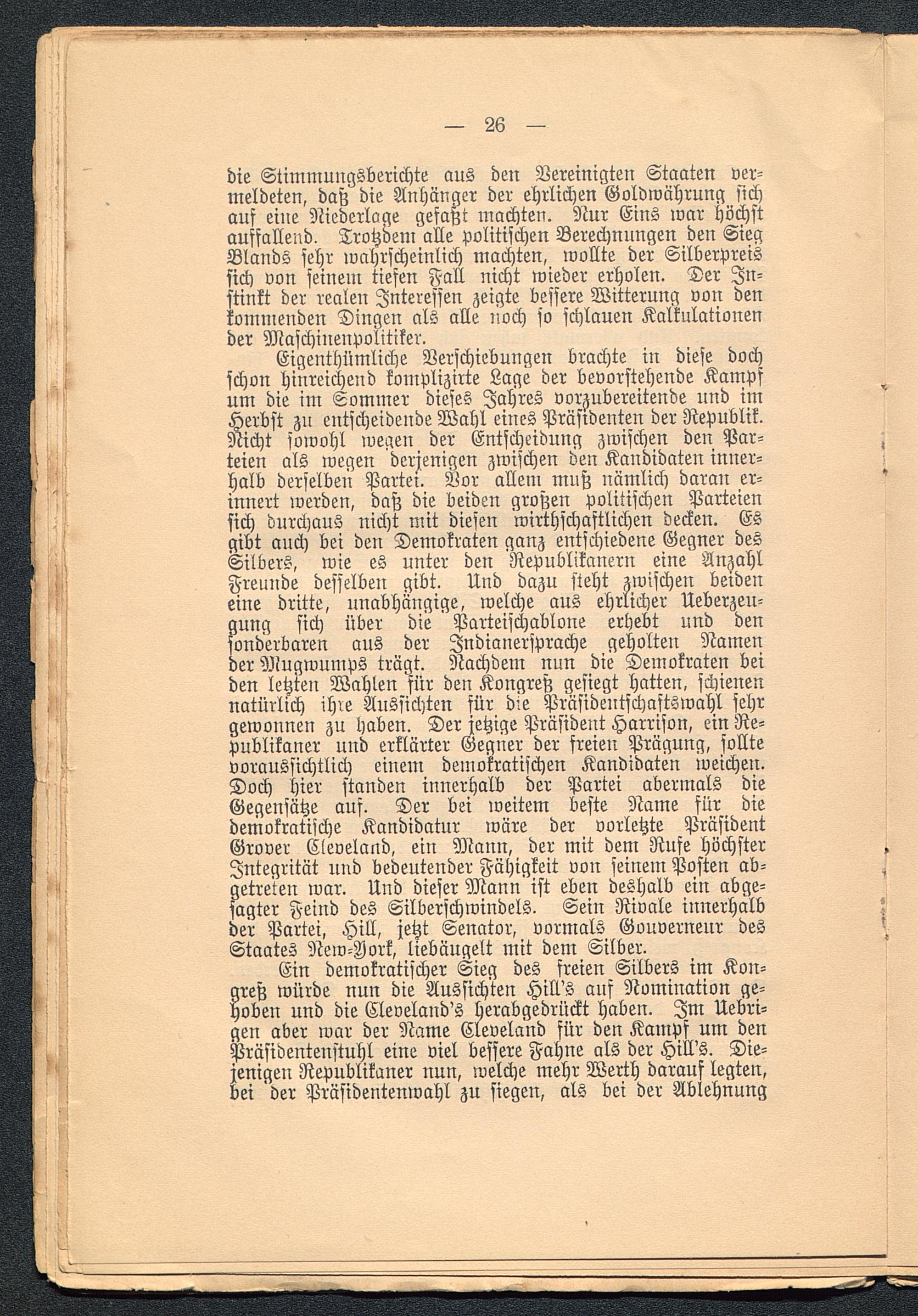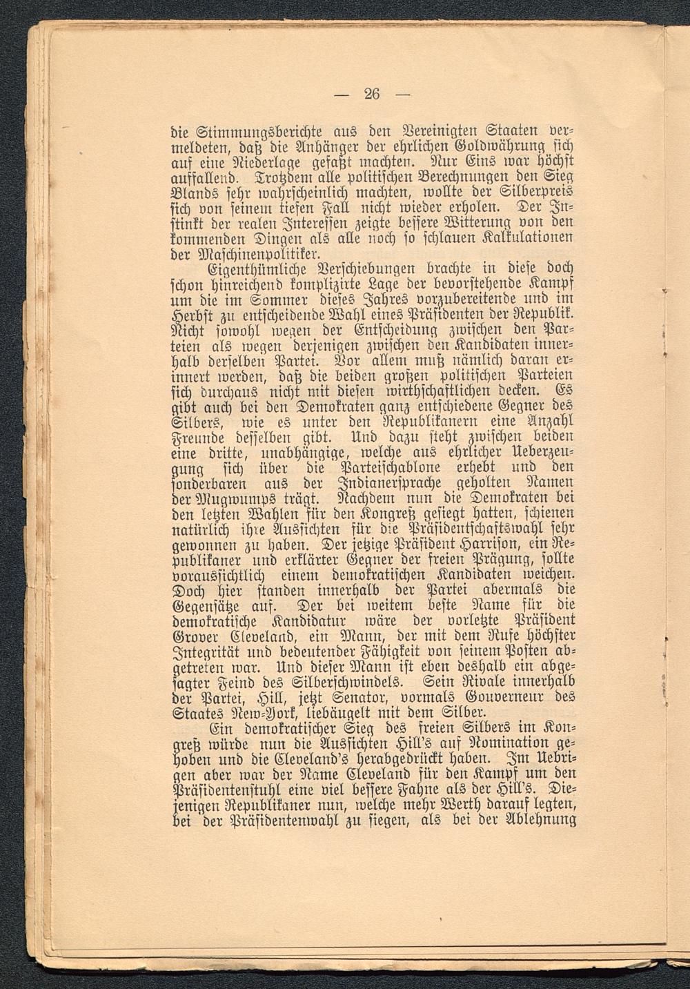 Eigenthümliche Verschiebungen brachte in diese dochschon hinreichend komplizirte Lage der bevorstehende Kampfum die im Lommer dieses Jahres vorzubereitende und imHerbst zu entscheidende Wahl eines Präsidenten der Republik.Nicht sowohl wegen der Entscheidung zwischen den Par-teien als wegen derjenigen zwischen den Kandidaten inner-halb derselben Partei. Vor allem muß nämlich daran er-innert werden, daß die beiden großen politischen Parteiensich durchaus nicht mit diesen wirthschaftlichen decken. Esgibt auch bei den Demokraten ganz entschiedene Gegner desSilbers, wie es unter den 'Republikanern eine AnzahlFreunde desselben gibt. Und dazu steht zwischen beideneine dritte, unabhängige, welche aus ehrlicher Ueberzeu-gung sich über die Parteischablone erhebt und densonderbaren aus der Jndianersprache geholten Namender Mugwumps trägt. Nachdem nun die Demokraten beiden letzten Wahlen für den Kongreß gesiegt hatten, schienennatürlich ihre Aussichten für die Präsidentschastswahl sehrgewonnen zu haben. Der jetzige Präsident Harrison, ein Re-publikaner und erklärter Gegner der freien Prägung, solltevoraussichtlich einem demokratischen Kandidaten weichen.Doch hier standen innerhalb der Partei abermals dieGegensätze aus. Der bei weitem beste Name für diedemokratische Kandidatur wäre der vorletzte PräsidentGrover Cleveland , ein Mann, der mit dem Rufe höchsterIntegrität und bedeutender Fähigkeit von seinem Posten ab-getreten war. Und dieser Mann ist eben deshalb ein abge-sagter Feind des Silberschwindels. Sein Rivale innerhalbder Partei, Hill, jetzt Senator, vormals Gouverneur desStaates New-Iork, liebäugelt mit dem Silber.