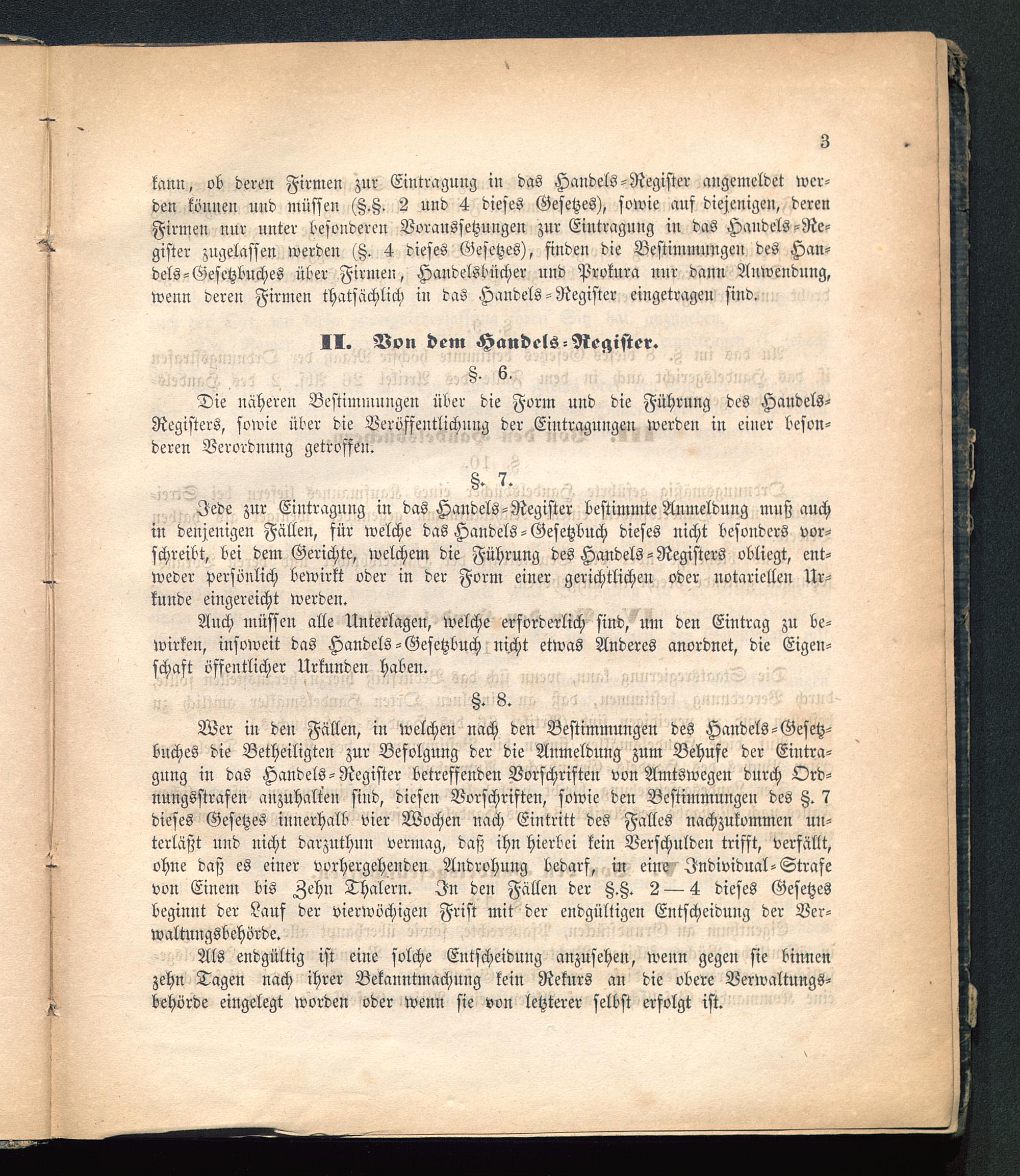 Wer in den Fällen, in welchen nach den Bestimmungen des Handels-Gesetz-buches die Betheiligten zur Befolgung der die Anmeldung zum Behufe der Eintra-gung in das Handels-Register betreffenden Vorschriften von Amtswegen durch Ord-nungsstrafen anzuhalten sind, diesen Vorschriften, sowie den Bestimmungen des tz. 7dieses Gesetzes innerhalb vier Wochen nach Eintritt des Falles nachzukommen un-terläßt und nicht darzuthun vermag, daß ihn hierbei kein Verschulden trifft, verfällt,ohne daß es einer vorhergehenden Androhung bedarf, in eine Individual-Strafevon Einem bis Zehn Thalern. In den Fällen der tz.Z. 2 — 4 dieses Gesetzesbeginnt der Lauf der vierwöchigen Frist mit der endgültigen Entscheidung der Ver-waltungsbehörde.