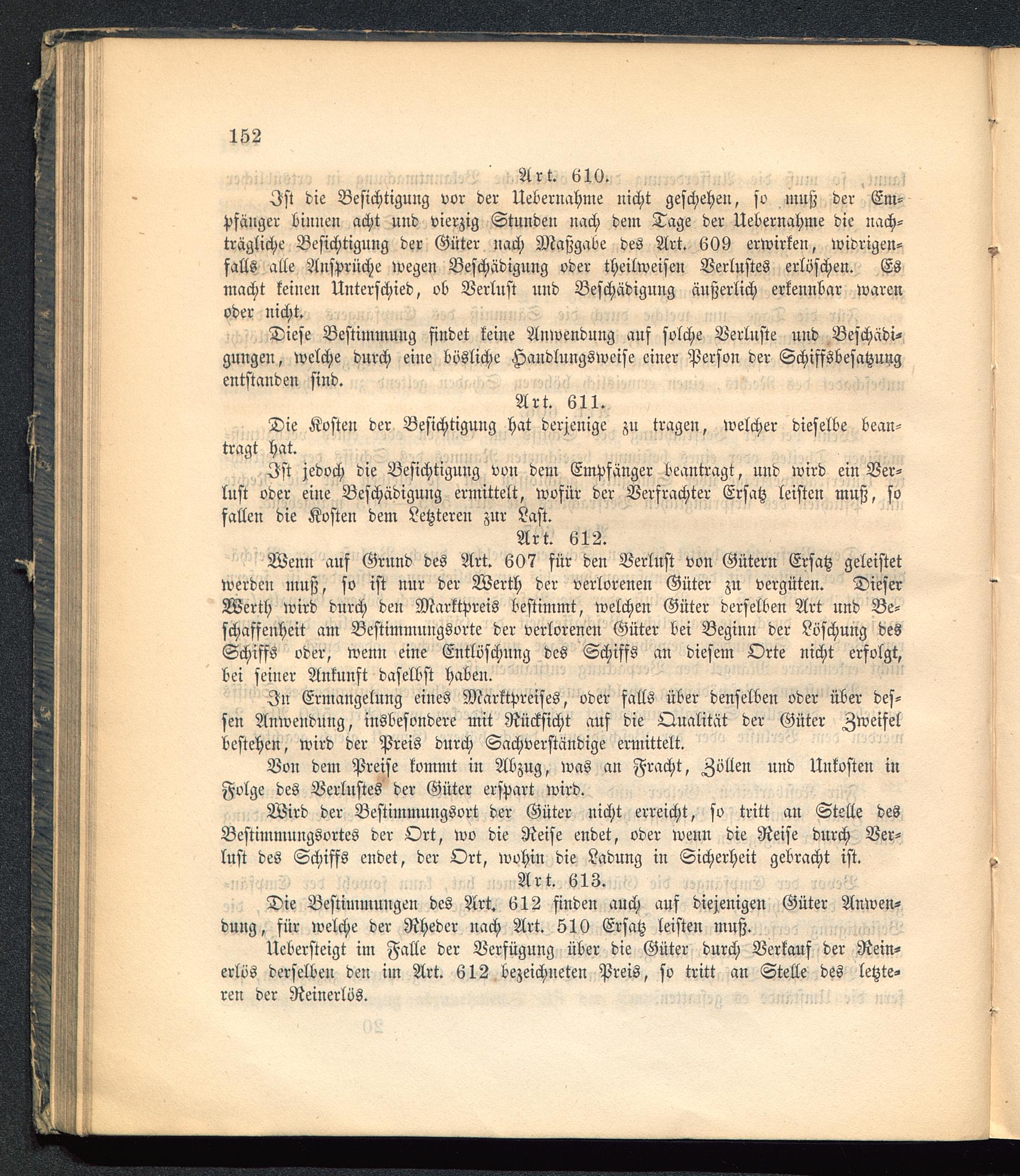 Wenn auf Grund des Art. 607 für den Verlust von Gütern Ersatz geleistetwerden muß, so ist nur der Werth der verlorenen Güter zu vergüten. DieserWerth wird durch den Marktpreis bestimmt, welchen Güter derselben Art und Be-schaffenheit am Bestimmungsorte der verlorenen Güter bei Beginn der Löschung desSchiffs oder, wenn eine Entlöschung des Schiffs an diesem Orte nicht erfolgt,bei seiner Ankunft daselbst haben.