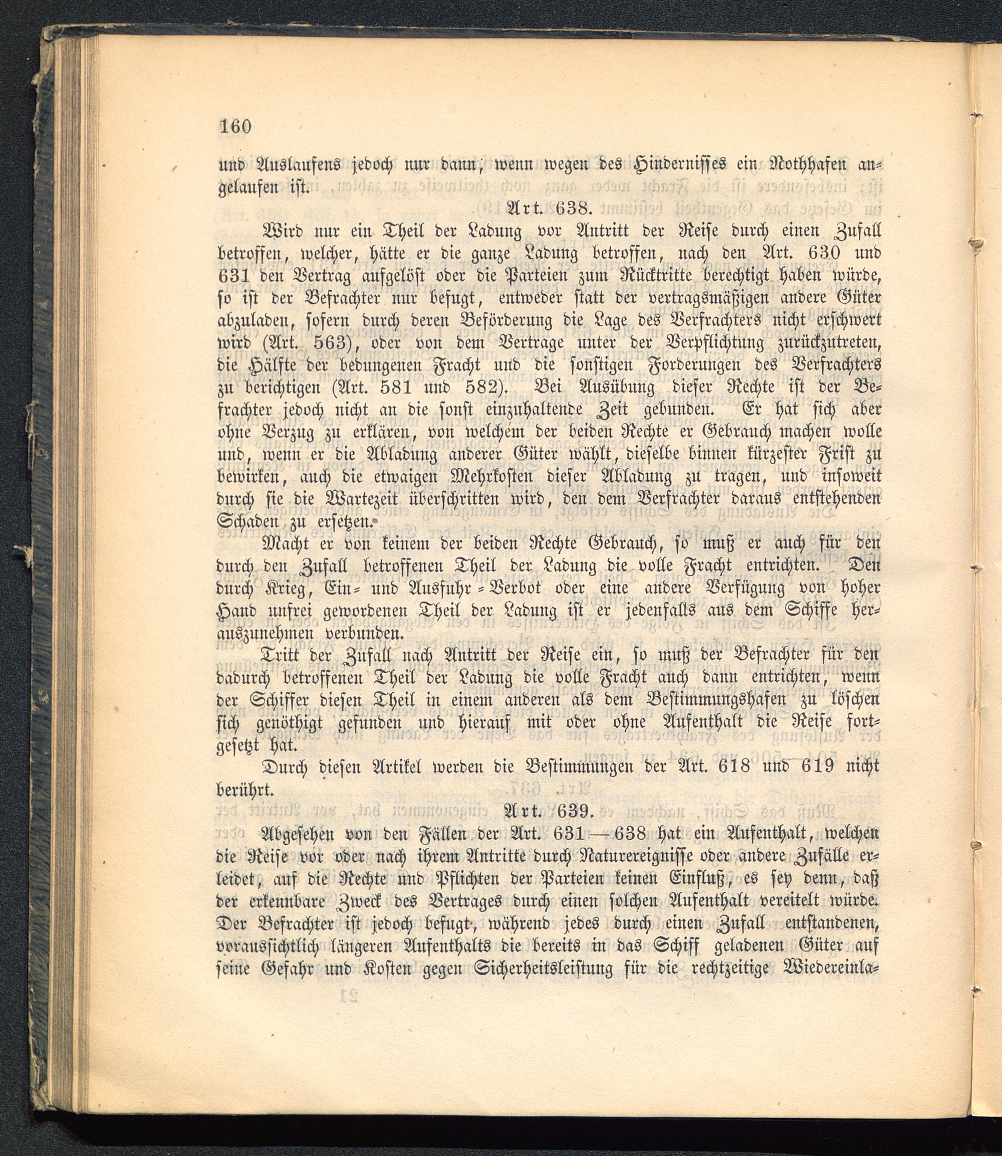 Abgesehen von den Fallen der Art. 631 —638 hat ein Aufenthalt, welchendie Reise vor oder nach ihrem Antritte durch Naturereignisse oder andere Zufälle er-leidet, auf die Rechte und Pflichten der Parteien keinen Einfluß, es sey denn, daßder erkennbare Zweck des Vertrages durch einen solchen Aufenthalt vereitelt würde.Der Befrachter ist jedoch befugt-, während jedes durch einen Zufall entstandenen,voraussichtlich längeren Aufenthalts die bereits in das Schiff geladenen Güter aufseine Gefahr und Kosten gegen Sicherheitsleistung für die rechtzeitige Wiedereinla-