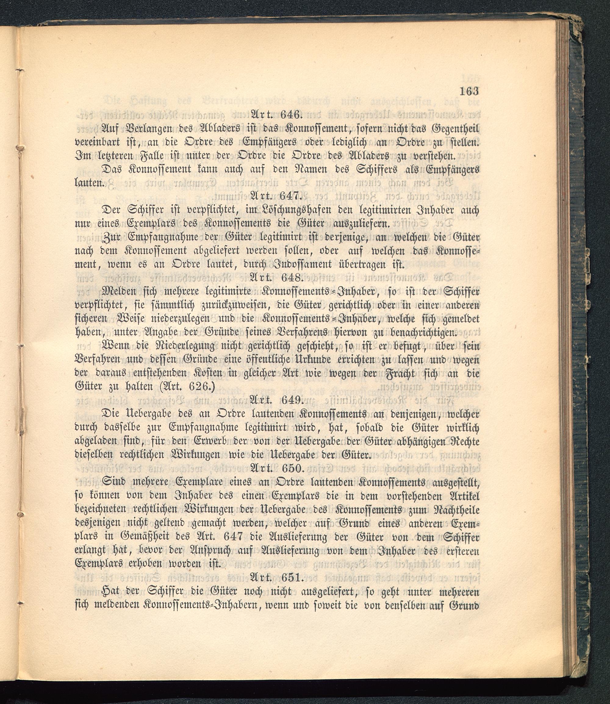 Sind mehrere Exemplare eines an Ordre lautenden Konnossements ausgestellt,so können von dem Inhaber des einen Exemplars die in dem vorstehenden Artikelbezeichneten rechtlichen Wirkungen der Uebergabe des Konnossements zum Nachtheiledesjenigen nicht geltend gemacht werden, welcher auf Grund eines anderen Exem-plars in Gemäßheit des Art. 647 die Auslieferung der Güter von dem Schiffererlangt hat, bevor der Anspruch auf Auslieferung von dem Inhaber des ersterenExemplars erhoben worden ist.