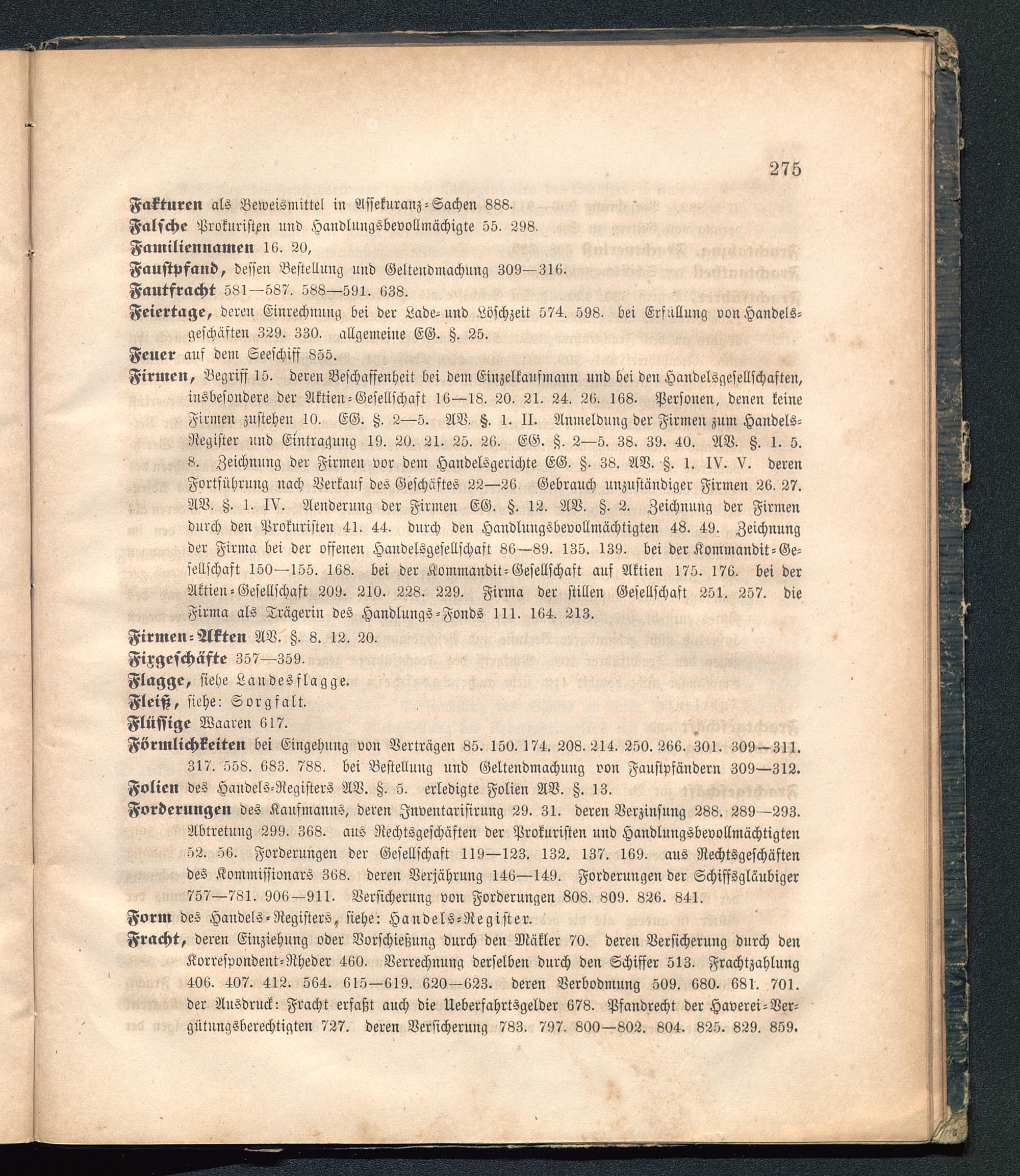 Forderungen des Kaufmanns, deren Jnventarisirung 29. 31. deren Verzinsung 288. 289 —293.Abtretung 299. 368. aus Rechtsgeschäften der Prokuristen und Handlungsbevollmächtigten52. 56. Forderungen der Gesellschaft 119—123. 132. 137. 169. aus Rechtsgeschäftendes Kommissionärs 368. deren Verjährung 146—149. Forderungen der Schiffsgläubiger757—781. 906—911. Versicherung von Forderungen 808. 809. 826. 841.