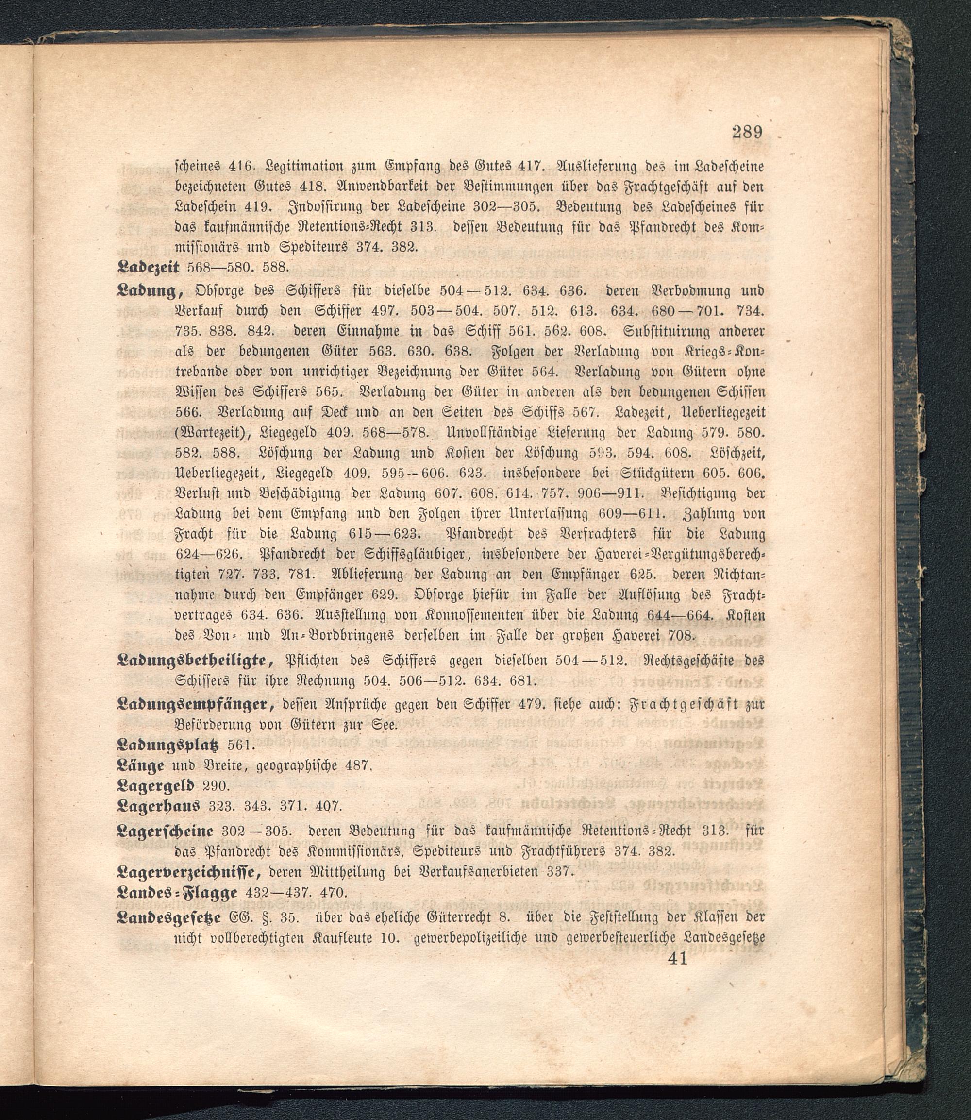 scheines 416. Legitimation zum Empfang des Gutes 417. Auslieferung des im Ladescheinebezeichneten Gutes 418. Anwendbarkeit der Bestimmungen über das Frachtgeschäft auf denLadeschein 419. Jndossirung der Ladescheine 302—305. Bedeutung des Ladescheines fürdas kaufmännische Retentions-Recht 313. dessen Bedeutung für das Pfandrecht des Kom-missionärs und Spediteurs 374. 382.