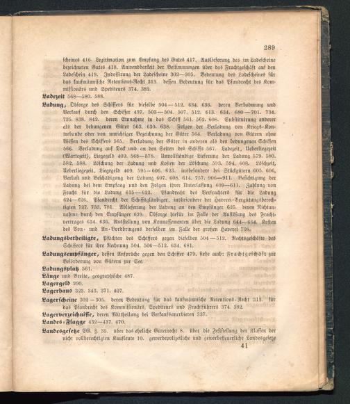 Ladung, Obsorge des Schiffers für dieselbe 504 — 512. 634. 636. deren Verbodmung undVerkauf durch den Schiffer 497. 503 — 504. 507. 512. 613. 634. 680 — 701. 734.735. 838. 842. deren Einnahme in das Schiff 561. 562. 608. Substituirung andererals der bedungenen Güter 563. 630. 638. Folgen der Verladung von Kriegs-Kon-trebande oder von unrichtiger Bezeichnung der Güter 564. Verladung von Gütern ohneWissen des Schiffers 565. Verladung der Gitter in anderen als den bedungenen Schiffen566. Verladung auf Deck und an den Seiten des Schiffs 567. Ladezeit, Ueberliegezeit(Wartezeit), Liegegeld 409. 568 — 578. Unvollständige Lieferung der Ladung 579. 580.582. 588. Löschung der Ladung und Kosten der Löschung 593. 594. 608. Löschzeit,Ueberliegezeit, Liegegeld 409. 595—606. 623. insbesondere bei Stückgütern 605. 606.Verlust und Beschädigung der Ladung 607. 608. 614. 757. 906 — 911. Besichtigung derLadung bei dem Empfang und den Folgen ihrer Unterlassung 609 — 611. Zahlung vonFracht für die Ladung 615 — 623. Pfandrecht des Verfrachters für die Ladung624—626. Pfandrecht der Schiffsgläubiger, insbesondere der Haverei-Vergütungsberech-tigten 727. 733. 781. Ablieferung der Ladung an den Empfänger 625. deren Nichtan-nahme durch den Empfänger 629. Obsorge hiefür im Falle der Auslösung des Fracht-vertrages 634. 636. Ausstellung von Konnossementen über die Ladung 644—664. Kostendes Von- und An-Bordbringens derselben im Falle der großen Haverei 708.
