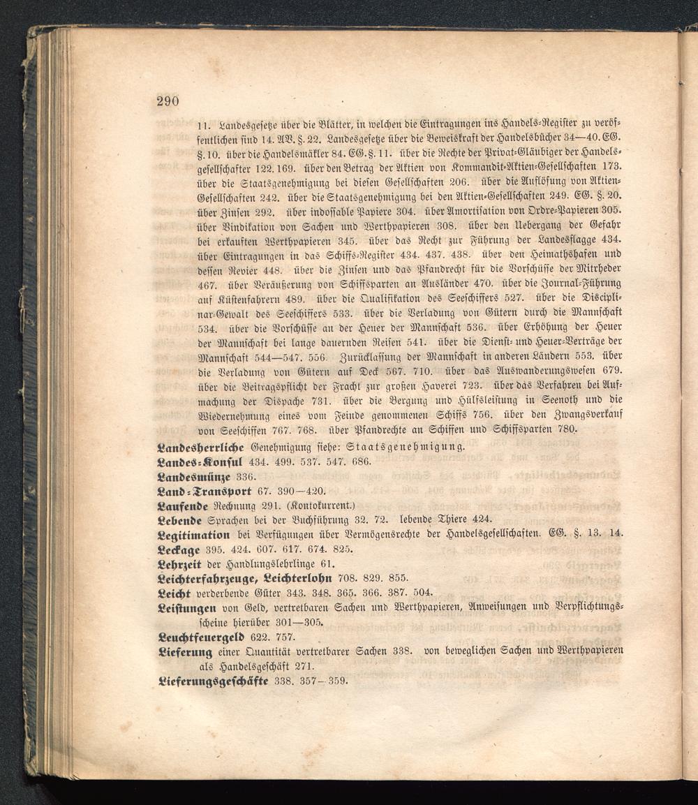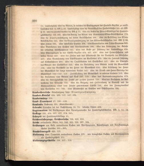 I I. Landesgesetze über die Blätter, in welchen die Eintragungen ins Handels-Register zu veröf-fentlichen sind 14. AV. Z. 22. Landesgesetze über die Beweiskraft der Handelsbücher 34—40. EG.Z. 10. über die Handelsmäkler 84. EG.ß. I I- über die Rechte der Privat-Gläubiger der Handels-gesellschafter 122.169. über den Betrag der Aktien von Kommandit-Aktien-Gesellschaften 173.über die Staatsgenehmigung bei diesen Gesellschaften 206. über die Auflösung vonAktien-Gesellschaften 242. über die Staatsgenehmigung bei den Aktien-Gesellschaften 249. EG. Z. 20.über Zinsen 292. über indossable Papiere 304. über Amortisation von Ordre-Papieren 305.über Vindikation von Sachen und Werthpapieren 308. über den Uebergang der Gefahrbei erkauften Werthpapieren 345. über das Recht zur Führung der Landesflagge 434.über Eintragungen in das Schiffs-Negister 434. 437. 438. über den Heimathshafen unddessen Revier 448. über die Zinsen und das Pfandrecht für die Vorschüsse der Mitrheder467. über Veräußerung von Schiffsparten an Ausländer 470. über die Journal-Führungauf Küstenfahrern 489. über die Qualifikation des Seeschiffers 527. über die Discipli-narGewalt des Seeschiffers 533. über die Verladung von Gütern durch die Mannschaft534. über die Vorschüsse an der Heuer der Mannschaft 536. über Erhöhung der Heuerder Mannschaft bei lange dauernden Reisen 541. über die Dienst-und Heuer-Verträge derMannschaft 544—547. 556. Zurücklassung der Mannschaft in anderen Ländern 553. überdie Verladung von Gütern auf Deck 567. 710. über das Auswanderungswesen 679.über die Beitragspflicht der Fracht znr großen Haverei 723. über das Verfahren bei Auf-machung der Dispache 731. über die Bergung und Hülfsleistung in Seenoth und dieWiedernehmung eines vom Feinde genommenen Schiffs 756. über den Zwangsverkaufvon Seeschiffen 767. 768. über Pfandrechte an Schiffen und Schiffsparten 780.