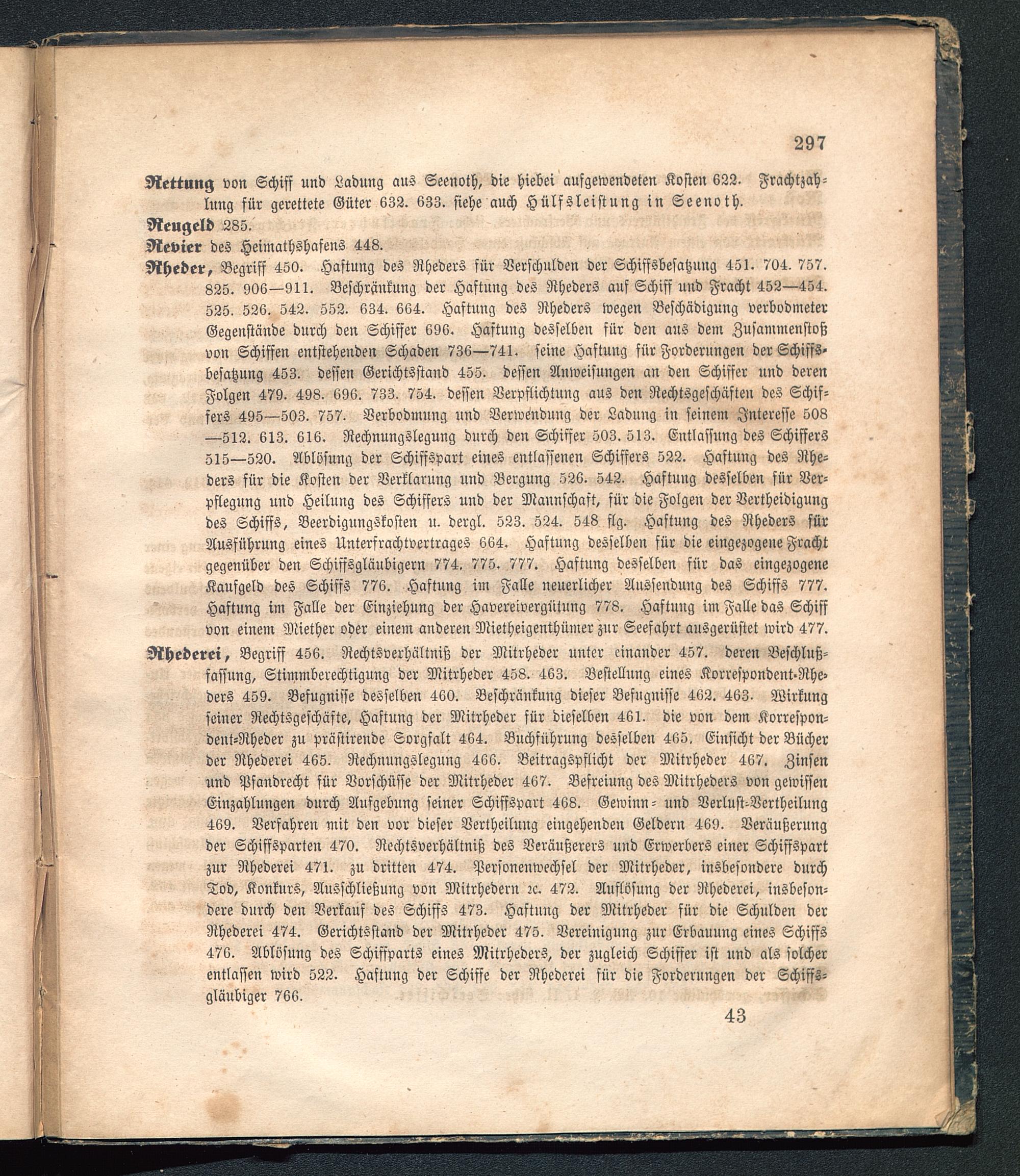 Rheder, Begriff 450. Haftung des Rheders für Verschulden der Schiffsbesatzung 451. 704. 757.825. 906—911. Beschränkung der Haftung des Rheders auf Schiff und Fracht 452—454.525. 526. 542. 552. 634. 664. Haftung des Rheders wegen Beschädigung verbodmeterGegenstände durch den Schiffer 696. Haftung desselben für den aus dem Zusammenstoßvon Schiffen entstehenden Schaden 736—741. seine Haftung für Forderungen der Schiffs-besatzung 453. dessen Gerichtsstand 455. dessen Anweisungen an den Schiffer und derenFolgen 479. 498. 696. 733. 754. dessen Verpflichtung aus den Rechtsgeschäften des Schif-fers 495—503. 757. Verbodmung und Verwendung der Ladung in seinem Interesse 508—512. 613. 616. Rechnungslegung durch den Schiffer 503. 513. Entlassung des Schiffers515—520. Ablösung der Schiffspart eines entlassenen Schiffers 522. Haftung des Nhe-ders für die Kosten der Verklarung und Bergung 526. 542. Haftung desselben für Ver-pflegung und Heilung des Schiffers und der Mannschaft, für die Folgen der Vertheidigungdes Schiffs, Beerdigungskosten u. dergl. 523. 524. 548 flg. Haftung des Rheders fürAusführung eines Unterfrachtvertrages 664. Haftung desselben für die eingezogene Frachtgegenüber den Schiffsgläubigern 774. 775. 777. Haftung desselben für das eingezogeneKaufgeld des Schiffs 776. Haftung im Falle neuerlicher Aussendung des Schiffs 777.Haftung im Falle der Einziehung der Havereivergütung 778. Haftung im Falle das Schiffvon einem Miether oder einen: anderen Mietheigenthümer zur Seefahrt ausgerüstet wird 477.