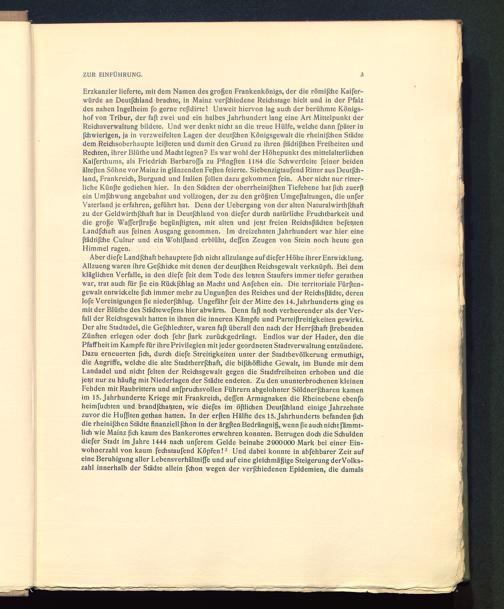 Aber diefe Landfchaft behauptete ßch nicht allzulange auf diefer Höhe ihrer Entwicklung.Allzueng waren ihre Gefchicke mit denen der deutfchen Reichsgewalt verknüpft. Bei demkläglichen Verfalle, in den diefe feit dem Tode des lebten Staufers immer tiefer gerathenwar, trat auch für ße ein Rückfchlag an Macht und Anfehen ein. Die territoriale Fürßen-gewalt entwickelte ßch immer mehr zu Ungunften des Reiches und der Reichsftädte, derenlofe Vereinigungen ße niederfchlug. Ungefähr feit der Mitte des 14. Jahrhunderts ging esmit der Blüthe des Städtewefens hier abwärts. Denn faß noch verheerender als der Ver-fall der Reichsgewalt hatten in ihnen die inneren Kämpfe und Parteiftreitigkeiten gewirkt.Der alte Stadtadel, die Gefchlechter, waren faß überall den nach der Herrfchaft ßrebendenZünften erlegen oder doch fehr ftark zurückgedrängt. Endlos war der Hader, den diePfaffheit im Kampfe für ihre Privilegien mit jeder geordneten Stadtverwaltung entzündete.Dazu erneuerten ßch, durch diefe Streitigkeiten unter der Stadtbevölkerung ermuthigt,die Angriffe, welche die alte Stadtherrßhaft, die bifchöfliche Gewalt, im Bunde mit demLandadel und nicht feiten der Reichsgewalt gegen die Stadtfreiheiten erhoben und diejetjt nur zu häufig mit Niederlagen der Städte endeten. Zu den ununterbrochenen kleinenFehden mit Raubrittern und anfpruchsvollen Führern abgelohnter Söldnerfcharen kamenim 15. Jahrhunderte Kriege mit Frankreich , deffen Armagnaken die Rheinebene ebenfoheimfuchten und brandjchatjten, wie diefes im öftlichen Deutfchland einige Jahrzehntezuvor die Huffiten gethan hatten. In der erften Hälfte des 15. Jahrhunderts befanden ßchdie rheinifchen Städte finanziell fchon in der ärgßen Bedrängniß, wenn ße auch nicht fämmt-lich wie Mainz ßch kaum des Bankerottes erwehren konnten. Betrugen doch die Schuldendiefer Stadt im Jahre 1444 nach unferem Gelde beinahe 2900000 Mark bei einer Ein-wohnerzahl von kaum fechstaufend Köpfen! 2 Und dabei konnte in abfehbarer Zeit aufeine Beruhigung aller Lebensverhältniffe und auf eine gleichmäßige Steigerung derVolks-zahl innerhalb der Städte allein fchon wegen der verßhiedenen Epidemien, die damals
