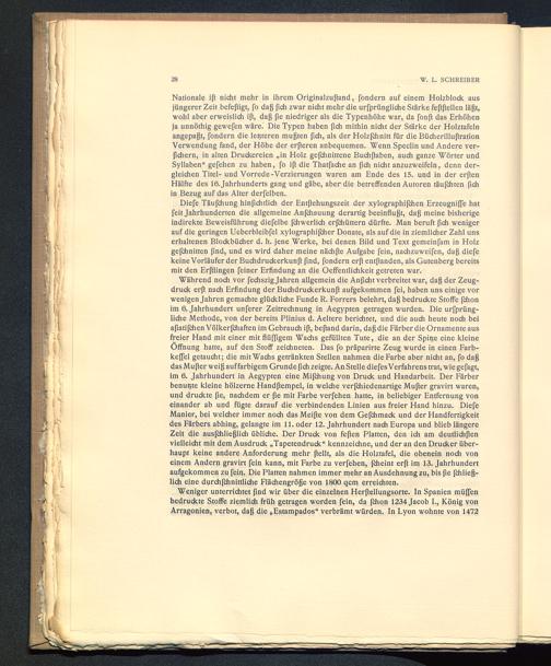 Weniger unterrichtet ßnd wir über die einzelnen Herßellungsorte. In Spanien müffenbedruckte Stoffe ziemlich früh getragen worden fein, da ßhon 1234 Jacob I. , König vonArragonien , verbot, daß die „Estampados“ verbrämt würden. In Lyon wohnte von 1472