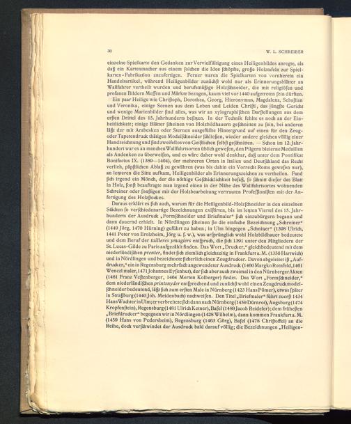 Daraus erklärt es fich auch, warum für die Heiligenbild-Holzfchneider in den einzelnenStädten fo verfchiedenartige Bezeichnungen exißirten, bis im lebten Viertel des 15. Jahr-hunderts der Ausdrude „Formfehneider und Briefmaler“ fich einzubürgern begann unddann dauernd erhielt. In Nördlingen (cheinen fie die einfache Bezeichnung „Schreiner “(1449 Jörg, 1470 Hürning) geführt zu haben; in Ulm hingegen „Sehniger“ (1398 Ulrich,1441 Peter von Erolzheim, Jörg u. f. w.), was urfprünglich wohl Holzbildhauer bedeuteteund dem Beruf der tailleres ymagiers entfprach, die fich 1391 unter den Mitgliedern derSt. Lucas-Gilde zu Paris aufgezählt finden. Das Wort „ Drucker,“ gleichbedeutend mit demniederländifchen prenter, findet fich ziemlich gleichzeitig in Frankfurt a. M. (1356 Hartwich)und in Nördlingen und bezeichnete ficherlich einen Zeugdrucker. Davon abgeleitet ift „Auf-drucker,“ ein in Regensburg mehrfach angewendeter Ausdruck (1460Margko Rotnfeld,1461Wenczl maler,1471Johannes Eyfenhut),der fich aber auch zweimal in den Nürnberger Akten(1461 Franz Veßenberger, 1464 Merten Kolberger) findet. Das Wort „Formfehneider,“dem niederländischen printsnyder entfprechend und zunächftwohl einen Zeugdruckmodel-(chneider bedeutend, läßt fich zum erßen Male in Nürnberg (1423 Hans Pömer), etwas fpäterin Straßburg (1440 Joh. Meidenbach) nachweifen. Den Titel „Briefmaler“ führt zuerß 1434HansWachter inUlm; erverbreitetefich dann nach Nürnberg (1459 Dürnrot),Augsburg (1474Kropfenßein),Regensburg (1481 UlrichKetner),Bafel (1489Jacob Reideler);dem früheren„Briefdrucker“ begegnen wir in Nördlingen (1428 Wilhelm), dann kommen Frankfurt a. M.(1459 Hans von Pedersheim), Regensburg (1463 Görg), Bafel (1478 Chriftoffel) an dieReihe, doch ver(chwindet der Ausdruck bald darauf völlig; die Bezeichnungen „Heiligen-