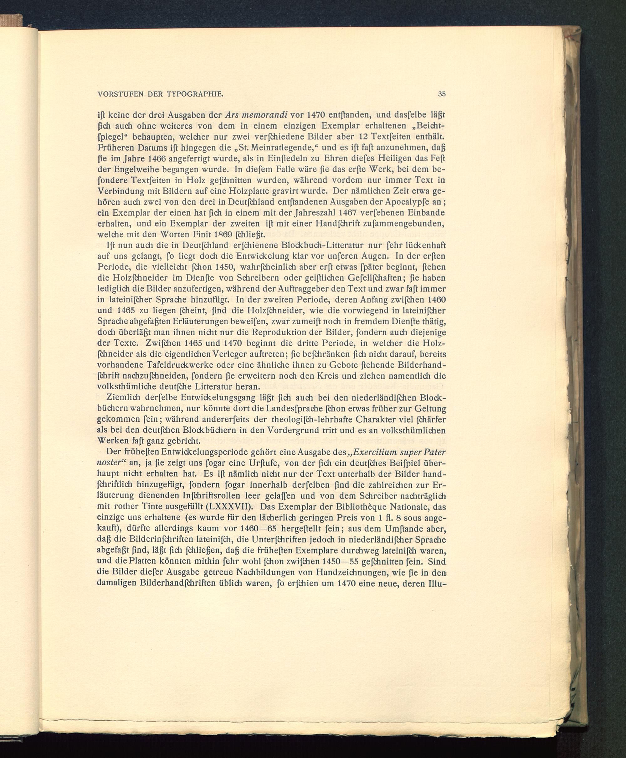 iß keine der drei Ausgaben der Ars memorandi vor 1470 entbanden, und dasfelbe lägtgeh auch ohne weiteres von dem in einem einzigen Exemplar erhaltenen „Beicht-fpiegel“ behaupten, welcher nur zwei verfchiedene Bilder aber 12 Textfeiten enthält.Früheren Datums iß hingegen die „St. Meinratlegende,“ und es iß faß anzunehmen, dagße im Jahre 1466 angefertigt wurde, als in Einßedeln zu Ehren diefes Heiligen das Feßder Engelweihe begangen wurde. In diefem Falle wäre ße das erße Werk, bei dem be-fondere Textfeiten in Holz geßhnitten wurden, während vordem nur immer Text inVerbindung mit Bildern auf eine Holzplatte gravirt wurde. Der nämlichen Zeit etwa ge-hören auch zwei von den drei in Deutßhland entßandenen Ausgaben der Apocalypfe an ;ein Exemplar der einen hat ßch in einem mit der Jahreszahl 1467 verfehenen Einbandeerhalten, und ein Exemplar der zweiten iß mit einer Handfchrift zufammengebunden,welche mit den Worten Finit 1869 ßhließt.