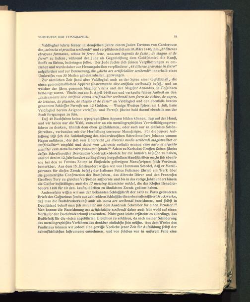 Valdfoghel lehrte ferner in demfelben Jahre einem Juden Davinus von Carderousedie „scienda et practica scribendi“ und verpflichtete [ich am 10. März 1446, ihm „27 litterasebraycas formatas, scisas in ferro bene, unacum ingeniis de fuste , de stagno et deferro“ zu liefern, während der Jude als Gegenlei[tung dem Goldfehmied die Kunß,Stoffe zu färben, beibringen follte. Der Jude fuchte fich feinen Verpflichtungen zu ent-ziehen und wurde daher zur Herausgabe ihm verpfändeter „48 litterae gravatae in ferro“aufgefordert und zur Beteuerung, die „dicta ars artificialiter scribendi“ innerhalb einesUmkreifes von 30 Meilen geheimzuhalten, gezwungen.