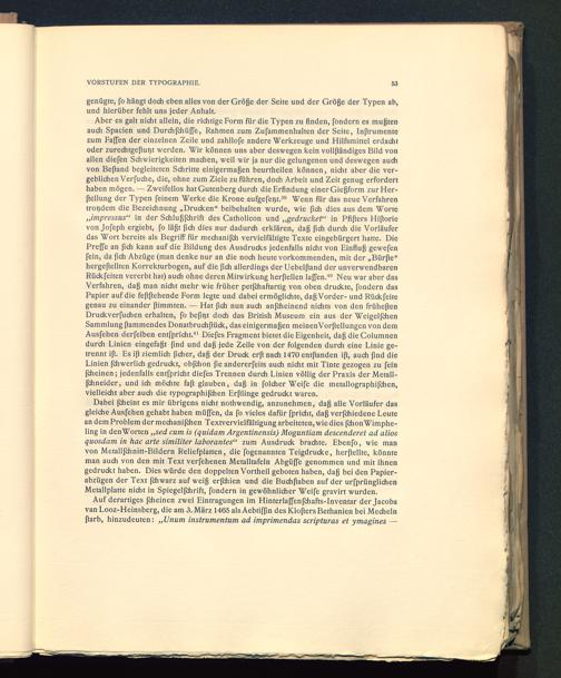 Aber es galt nicht allein, die richtige Form für die Typen zu finden, fondern es mußtenauch Spacien und Durchfchüße, Rahmen zum Zufammenhalten der Seite, Inßrumentezum Faßen der einzelnen Zeile und zahllofe andere Werkzeuge und Hilfsmittel erdachtoder zurechtgeßutjt werden. Wir können uns aber deswegen kein vollßändiges Bild vonallen diefen Schwierigkeiten machen, weil wir ja nur die gelungenen und deswegen auchvon Beßand begleiteten Schritte einigermaßen beurtheilen können, nicht aber die ver-geblichen Verfu die, die, ohne zum Ziele zu führen, doch Arbeit und Zeit genug erforderthaben mögen. — Zweifellos hat Gutenberg durch die Erfindung einer Gießform zurHer-ßellung der Typen feinem Werke die Krone aufgefe^t. 39 Wenn für das neue Verfahrentrotjdem die Bezeichnung „Drucken“ beibehalten wurde, wie fich dies aus dem Worte„ impressus “ in der Schlußfchrift des Catholicon und „ gedruckef‘ in Pfißers Hißorievon Jofeph ergiebt, fo läßt fich dies nur dadurch erklären, daß fich durch die Vorläuferdas Wort bereits als Begriff für mechanijch vervielfältigte Texte eingebürgert hatte. DiePreffe an fich kann auf die Bildung des Ausdrucks jedenfalls nicht von Einfluß gewefenfein, da fich Abzüge (man denke nur an die noch heute vorkommenden, mit der „Bürße“hergeftellten Korrekturbogen, auf die ßch allerdings der Uebelßand der unverwendbarenRückfeiten vererbt hat) auch ohne deren Mitwirkung herftellen laffen. 40 Neu war aber dasVerfahren, daß man nicht mehr wie früher petßhaftartig von oben druckte, fondern dasPapier auf die feßßehende Form legte und dabei ermöglichte, daß Vorder- und Rückfeitegenau zu einander ßimmten. — Hat ßch nun auch anfcheinend nichts von den früheßenDruckverfuchen erhalten, fo beßtjt doch das British Museum ein aus der WeigelfchenSammlung ftammendes Donatbruchßück, das einigermaßen meinenVorßellungen von demAusfehen derfelben entfpricht. 41 Diefes Fragment bietet die Eigenheit, daß dieColumnendurch Linien eingefaßt find und daß jede Zeile von der folgenden durch eine Linie ge-trennt iß. Es iß ziemlich ßcher, daß der Druck erft nach 1470 entftanden iß, auch find dieLinien (chwerlich gedruckt, objchon ße andererfeits auch nicht mit Tinte gezogen zu fein(cheinen; jedenfalls entfpricht diefes Trennen durch Linien völlig der Praxis der Metall-jchneider, und ich möchte faß glauben, daß in folcher Weife die metallographifchen,vielleicht aber auch die typographißhen Erftlinge gedruckt waren.
