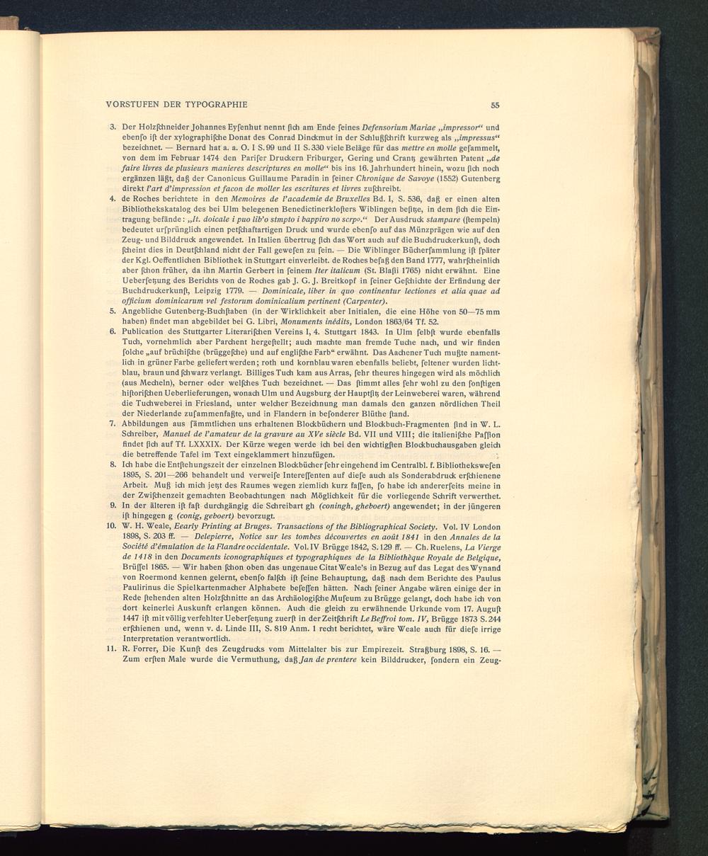 3. Der Holzfchneider Johannes Eyfenhut nennt [Ich am Ende feines Defensorium Mariae „impressor“ undebenfo iß der xylographifche Donat des Conrad Dinckmut in der Schlußfchrift kurzweg als „ impressus “bezeichnet. — Bernard hat a. a. O. I S.99 und II S.330 viele Beläge für das mettre en molle gefammelt,von dem im Februar 1474 den Parifer Druckern Friburger, Gering und Cranß gewährten Patent „defaire livres de plusieurs manieres descriptures en molle“ bis ins 16. Jahrhundert hinein, wozu [Ich nochergänzen läßt, daß der Canonicus Guillaume Paradin in feiner Chronique de Savoye (1552) Gutenberg direkt l’art d’impression etfacon de moller les escritures et livres zufchreibt.