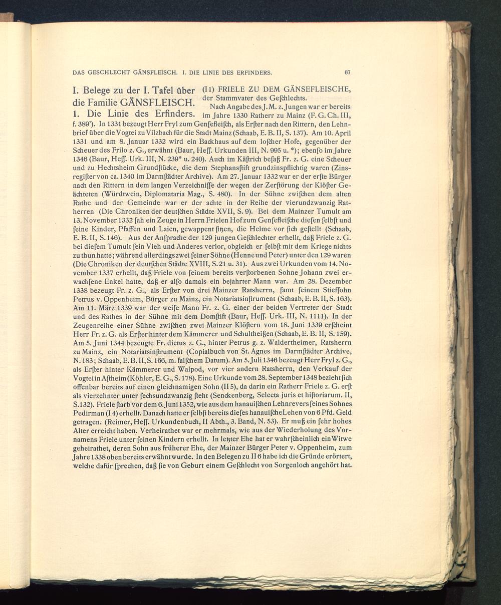 1. Die Linie des Erfinders, im Jahre 1330 Ratherr zu Mainz (F. G.Ch. III,f.389’). In 1331 bezeugt Herr Fryl zum Genfefleifch, als Erßer nach den Rittern, den Lehn-brief über die Vogtei zuVilzbach für die Stadt Mainz (Schaab, E. B. II, S. 137). Am 10. April1331 und am 8. Januar 1332 wird ein Backhaus auf dem lojcher Hofe, gegenüber derScheuer des Frilo z. G., erwähnt (Baur, Heff. Urkunden III, N. 995 u. *); ebenfo im Jahre1346 (Baur, Heff. Urk. III, N. 239* u. 240). Audi im Käßrich befaß Fr. z. G. eine Scheuerund zu Hechtsheim Grundftücke, die dem Stephansftift grundzinspflichtig waren (Zins-regißervon ca. 1340 im Darmftädter Archive). Am 27. Januar 1332war er der erfte Bürgernach den Rittern in dem langen Verzeichniffe der wegen der Zerftörung der Klößer Ge-ächteten (Würdtwein, Diplomataria Mag., S. 480). In der Sühne zwifchen dem altenRathe und der Gemeinde war er der achte in der Reihe der vierundzwanzig Rat-herren (Die Chroniken der deutfchen Städte XVII, S. 9). Bei dem Mainzer Tumult am13. November 1332 fah ein Zeugein Herrn Frielen Hof zum Genfefleifche diefen felbft undfeine Kinder, Pfaffen und Laien, gewappent fitjen, die Helme vor fich geteilt (Schaab,E. B. II, S. 146). Aus der Anfprache der 129 jungen Gefchlechter erhellt, daß Friele z. G.bei diefem Tumult fein Vieh und Anderes verlor, obgleich er felbft mit dem Kriege nichtszu thun hatte; während allerdings zwei feiner Söhne (Henne und Peter) unter den 129 waren(Die Chroniken der deutfchen Städte XVIII, S. 21 u. 31). Aus zwei Urkunden vom 14.No-vember 1337 erhellt, daß Friele von feinem bereits verftorbenen Sohne Johann zwei er-wachfene Enkel hatte, daß er alfo damals ein bejahrter Mann war. Am 28. Dezember1338 bezeugt Fr. z. G., als Erfter von drei Mainzer Ratsherrn, famt feinem StieffohnPetrus v. Oppenheim, Bürger zu Mainz, ein Notariatsinftrument (Schaab, E. B. II, S. 163).Am 11. März 1339 war der weife Mann Fr. z. G. einer der beiden Vertreter der Stadtund des Rathes in der Sühne mit dem Domftift (Baur, Heff. Urk. III, N. 1111). In derZeugenreihe einer Sühne zwifchen zwei Mainzer Klöftern vom 18. Juni 1339 erfcheintHerr Fr. z. G. als Erfter hinter dem Kämmerer und Schultheißen (Schaab, E. B. II, S. 159).Am 5. Juni 1344 bezeugte Fr. dictus z. G., hinter Petrus g. z. Waldertheimer, Ratsherrnzu Mainz, ein Notariatsinftrument (Copialbuch von St. Agnes im Darmftädter Archive,N. 183; Schaab, E. B. II, S. 166, m. falfchem Datum). Am 5.Juli 1346 bezeugt Herr Fryl z. G.,als Erfter hinter Kämmerer und Walpod, vor vier andern Ratsherrn, den Verkauf derVogtei in Aftheim (Köhler, E.G.,S. 178).Eine Urkunde vom28. September 1348 bezieht fichoffenbar bereits auf einen gleichnamigen Sohn (II5), da darin ein Ratherr Friele z. G. erftals vierzehnter unter fechsundzwanzig fteht (Senckenberg, Selecta juris et hiftoriarum. II,S.132). Friele ftarb vor dem 6.Juni 1352, wie ausdem hanauifchen Lehnrevers feines SohnesPedirman (1.4) erhellt. Danach hatte er felbft bereits diefes hanauifcheLehen von 6 Pfd. Geldgetragen. (Reimer, Heff. Urkundenbuch, II Abth., 3. Band, N. 53). Er muß ein fehr hohesAlter erreicht haben. Verheirathet war er mehrmals, wie aus der Wiederholung des Vor-namens Friele unter feinen Kindern erhellt. In le^ter Ehe hat er wahrfcheinlich einWitwegeheirathet, deren Sohn aus früherer Ehe, der Mainzer Bürger Peter v. Oppenheim, zumJahre 1338 oben bereits erwähnt wurde. In den Belegen zu II6 habe ich die Gründe erörtert,welche dafür fprechen, daß fie von Geburt einem Gefchlecht von Sorgenloch angehört hat.