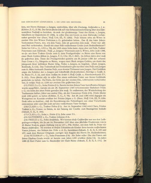 (19) FRIELO z. G., Sohn desfelben. Wir kennen diefe Gefchwißer nur aus den Leib-gedingsverträgen, die fie.am 14. November 1337 über eine jährliche Fruchtrente von je25 Malter Rocken, gegen Zahlung von je 13772 Pfd. Heller, mit dem Stift St. Peter vorMainz abfchloffen. Sie werden in diefen Urkunden als Kinder ihres bereits verdorbenenVaters Johann, des Sohnes des Frilo z. d. G., bezeichnet (Schaab, E. B. II, S..155 und157; nach dem Mainzer Originale corrigirt laut Angabe des Herrn Dr. Heidenheimer).