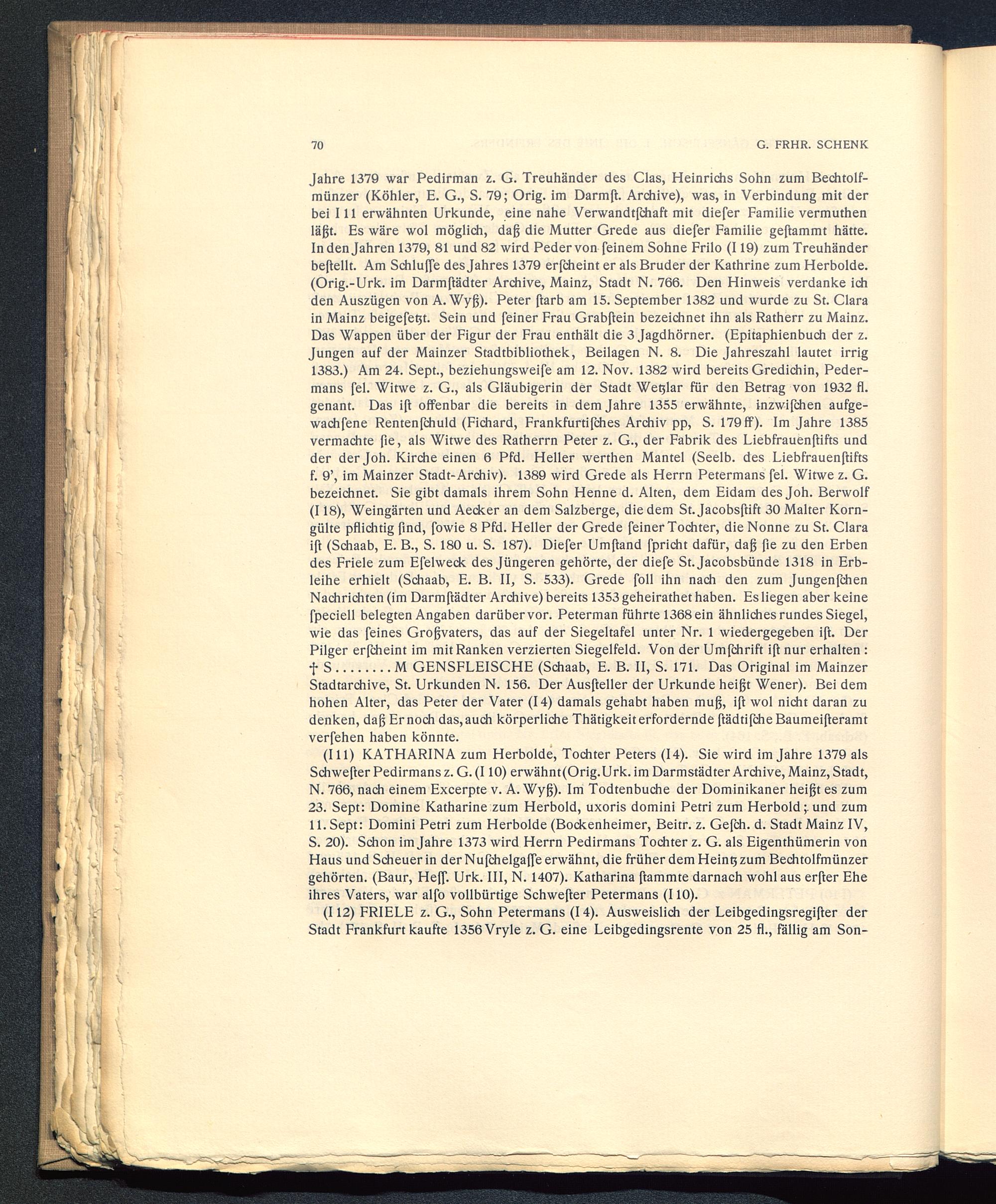 Jahre 1379 war Pedirman z. G. Treuhänder des Clas, Heinrichs Sohn zum Bechtolf-münzer (Köhler, E. G., S. 79; Orig, im Darmß. Archive), was, in Verbindung mit derbei 111 erwähnten Urkunde, eine nahe Verwandtßhaft mit diefer Familie vermuthenläßt. Es wäre wol möglich, daß die Mutter Grede aus diefer Familie geftammt hätte.In den Jahren 1379, 81 und 82 wird Peder von feinem Sohne Frilo (119) zum Treuhänderbeßellt. Am Schluffe des Jahres 1379 erßheint er als Bruder der Kathrine zum Herbolde.(Orig.-Urk. im Darmftädter Archive, Mainz , Stadt N. 766. Den Hinweis verdanke ichden Auszügen von A. Wyß). Peter ftarb am 15. September 1382 und wurde zu St. Clarain Mainz beigefetjt. Sein und feiner Frau Grabßein bezeichnet ihn als Ratherr zu Mainz .Das Wappen über der Figur der Frau enthält die 3 Jagdhörner. (Epitaphienbuch der z.Jungen auf der Mainzer Stadtbibliothek, Beilagen N. 8. Die Jahreszahl lautet irrig1383.) Am 24. Sept., beziehungsweife am 12. Nov. 1382 wird bereits Gredichin, Peder-mans fei. Witwe z. G., als Gläubigerin der Stadt Weilar für den Betrag von 1932 fl.genant. Das ift offenbar die bereits in dem Jahre 1355 erwähnte, inzwißhen aufge-wachfene Rentenßhuld (Fichard, Frankfurtifches Archiv pp, S. 179 ff). Im Jahre 1385vermachte fie, als Witwe des Ratherrn Peter z. G., der Fabrik des Liebfrauenßifts undder derjoh. Kirche einen 6 Pfd. Heller werthen Mantel (Seelb. des Liebfrauenftiftsf. 9’, im Mainzer Stadt-Archiv). 1389 wird Grede als Herrn Petermans fei. Witwe z. G.bezeichnet. Sie gibt damals ihrem Sohn Henne d. Alten, dem Eidam des Joh. Berwolf(118), Weingärten und Aecker an dem Salzberge, die dem St. Jacobsftift 30 Malter Korn-gülte pflichtig find, fowie 8 Pfd. Heller der Grede feiner Tochter, die Nonne zu St. Claraift (Schaab, E. B., S. 180 u. S. 187). Diefer Umftand fpricht dafür, daß fie zu den Erbendes Friele zum Efelweck des Jüngeren gehörte, der diefe St. Jacobsbünde 1318 in Erb-leihe erhielt (Schaab, E. B. II, S. 533). Grede foll ihn nach den zum JungenfchenNachrichten (im Darmftädter Archive) bereits 1353 geheirathet haben. Es liegen aber keinefpeciell belegten Angaben darübervor. Peterman führte 1368 ein ähnliches rundes Siegel,wie das feines Großvaters, das auf der Siegeltafel unter Nr. 1 wiedergegeben ift. DerPilger erßheint im mit Ranken verzierten Siegelfeld. Von der Umßhrift ift nur erhalten :