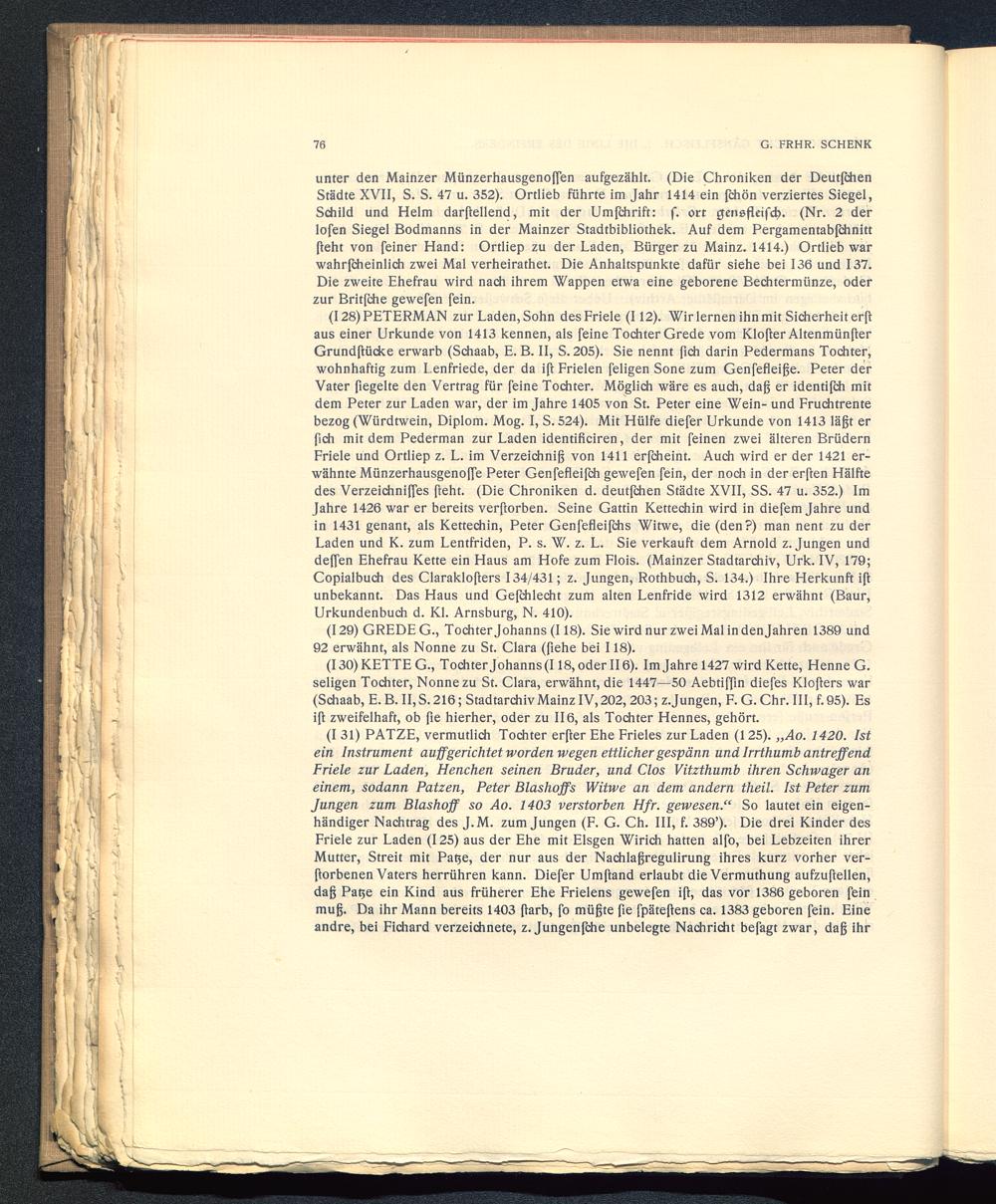 (128) PETERMAN zur Laden, Sohn desFriele (112). Wir lernen ihn mit Sicherheit erßaus einer Urkunde von 1413 kennen, als feine Tochter Grede vom Kloßer AltenmünßerGrundftücke erwarb (Schaab, E. B. II, S. 205). Sie nennt fich darin Pedermans Tochter,wohnhaftig zum Lenfriede, der da i[t Frielen feligen Sone zum Genfefleiße. Peter derVater fiegelte den Vertrag für feine Tochter. Möglich wäre es auch, dag er identißh mitdem Peter zur Laden war, der im Jahre 1405 von St. Peter eine Wein- und Fruchtrentebezog (Würdtwein, Diplom. Mog. I, S. 524). Mit Hülfe diefer Urkunde von 1413 lägt erfich mit dem Pederman zur Laden identificiren, der mit feinen zwei älteren BrüdernFriele und Ortliep z. L. im Verzeichnig von 1411 erfcheint. Auch wird er der 1421 er-wähnte Münzerhausgenoffe Peter Genfefleifch gewefen fein, der noch in der erften Hälftedes Verzeichniffes fteht. (Die Chroniken d. deutßhen Städte XVII, SS. 47 u. 352.) ImJahre 1426 war er bereits verftorben. Seine Gattin Kettechin wird in diefem Jahre undin 1431 genant, als Kettechin, Peter Genfefleighs Witwe, die (den?) man nent zu derLaden und K. zum Lentfriden, P. s. W. z. L. Sie verkauft dem Arnold z. Jungen unddeffen Ehefrau Kette ein Haus am Hofe zum Flois. (Mainzer Stadtarchiv, Urk. IV, 179;Copialbuch des Claraklofters 134/431; z. Jungen, Rothbuch, S. 134.) Ihre Herkunft ißunbekannt. Das Haus und Gefchlecht zum alten Lenfride wird 1312 erwähnt (Baur ,Urkundenbuch d. Kl. Arnsburg, N. 410).