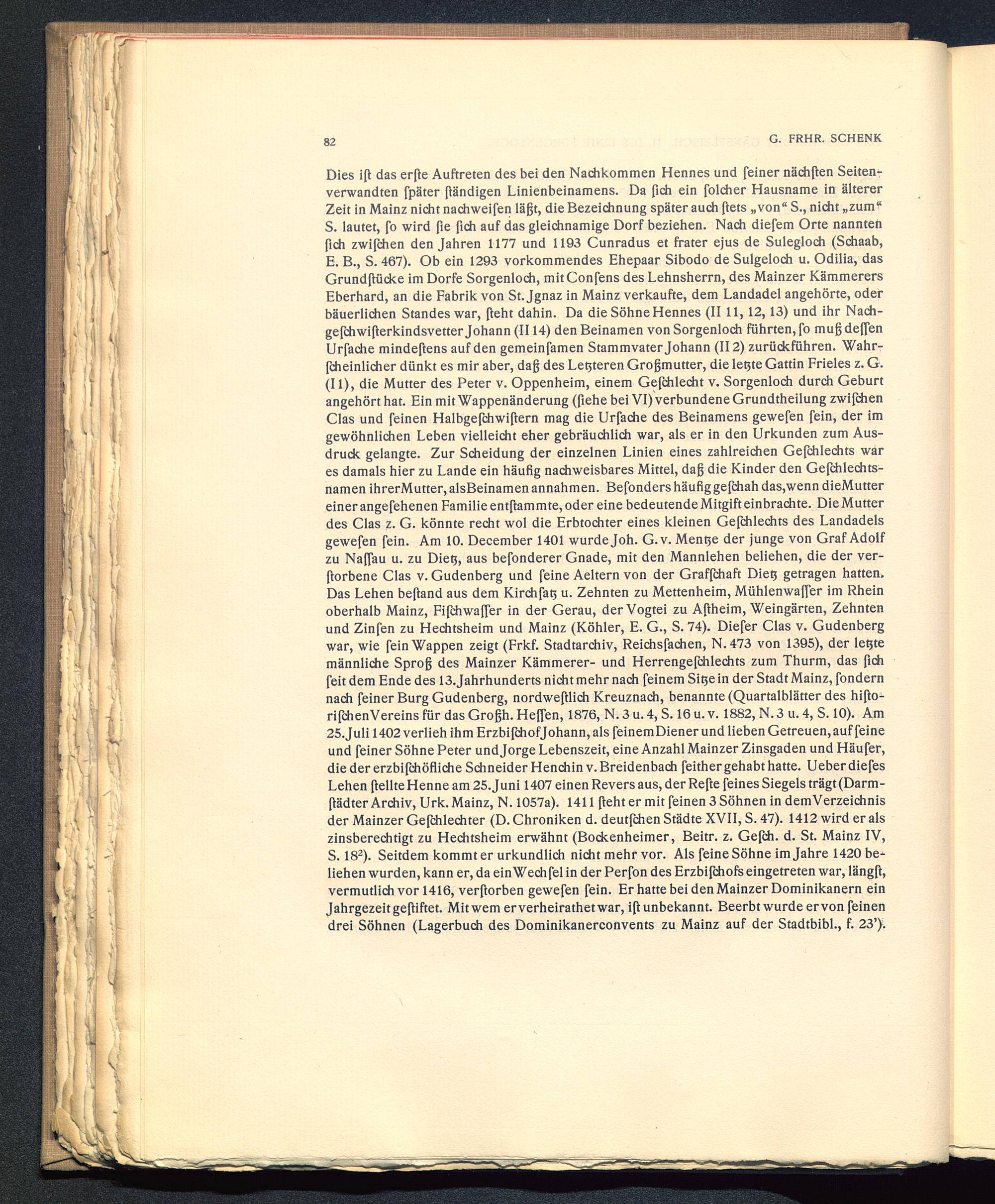Dies ig das erge Auftreten des bei den Nachkommen Hennes und feiner nächgen Seiten*verwandten fpäter gändigen Linienbeinamens. Da fich ein folcher Hausname in ältererZeit in Mainz nicht nachweifen lägt, die Bezeichnung später auch gets „von“ S., nicht „zum?S. lautet, fo wird fie fich auf das gleichnamige Dorf beziehen. Nach diefem Orte nanntenfich zwiphen den Jahren 1177 und 1193 Cunradus et frater ejus de Sulegloch (Schaab,E. B., S. 467). Ob ein 1293 vorkommendes Ehepaar Sibodo de Sulgeloch u. Odilia, dasGrundgücke im Dorfe Sorgenloch , mitConfens des Lehnsherrn, des Mainzer KämmerersEberhard, an die Fabrik von St. Jgnaz in Mainz verkaufte, dem Landadel angehörte, oderbäuerlichen Standes war, geht dahin. Da die Söhne Hennes (II 11 , 12,13) und ihr Nach-gephwigerkindsvetter Johann (II14) den Beinamen von Sorgenloch führten, fo mug dejfenUrfache mindeftens auf den gemeinfamen Stammvater Johann (II2) zurückführen. Wahr-(cheinlicher dünkt es mir aber, dag des Letjteren Grogmutter, die letzte Gattin Frieles z. G.(11), die Mutter des Peter v. Oppenheim, einem Gephlecht v. Sorgenloch durch Geburtangehört hat. Ein mit Wappenänderung (gehe bei VI) verbundene Grundtheilung zwiphenClas und feinen Halbgephwiftern mag die Urfache des Beinamens gewefen fein, der imgewöhnlichen Leben vielleicht eher gebräuchlich war, als er in den Urkunden zum Aus-drude gelangte. Zur Scheidung der einzelnen Linien eines zahlreichen Gefchlechts wares damals hier zu Lande ein häufig nachweisbares Mittel, dag die Kinder den Gephlechts-namen ihrerMutter, alsBeinamen annahmen. Befonders häufiggephah das,wenn dieMuttereiner angefehenen Familie entgammte, oder eine bedeutende Mitgift einbrachte. DieMutterdes Clas z. G. könnte recht wol die Erbtochter eines kleinen Gefchlechts des Landadelsgewefen fein. Am 10. December 1401 wurde Joh. G.v. Mentje der junge von Graf Adolfzu Najfau u. zu Diet}, aus befonderer Gnade, mit den Mannlehen beliehen, die der ver-gorbene Clas v. Gudenberg und feine Aeltern von der Grafghaft Dietj getragen hatten.Das Lehen begand aus dem Kirchfatj u. Zehnten zu Mettenheim, Mühlenwager im Rhein oberhalb Mainz , Fifchwajfer in der Gerau, der Vogtei zu Agheim, Weingärten, Zehntenund Zinfen zu Hechtsheim und Mainz (Köhler, E. G., S. 74). Diefer Clas v. Gudenbergwar, wie fein Wappen zeigt (Frkf. Stadtarchiv, Reichsfachen, N.473 von 1395), der legtemännliche Sprog des Mainzer Kämmerer- und Herrengefchlechts zum Thurm, das gehfeit dem Ende des 13.Jahrhunderts nicht mehr nach feinem Sigein der Stadt Mainz , fondernnach feiner Burg Gudenberg, nordweglich Kreuznach, benannte (Quartalblätter des higo*rijehenVereins für das Grogh. Heffen, 1876, N. 3 u. 4, S. 16 u. v. 1882, N. 3 u. 4, S. 10). Am25. Juli 1402 verlieh ihm Erzbifchofjohann, als feinemDiener und lieben Getreuen, auf feineund feiner Söhne Peter undjorge Lebenszeit, eine Anzahl Mainzer Zinsgaden und Häufer,diedererzbifchöfliche Schneider Henchin v.Breidenbach feither gehabt hatte. UeberdiefesLehen gellte Henne am 25. Juni 1407 einen Revers aus, der Rege feines Siegels trägt (Darm-gädter Archiv, Urk. Mainz, N. 1057a). 1411 geht er mit feinen 3 Söhnen in dem Verzeichnisder Mainzer Gefchlechter (D. Chroniken d. deutphen Städte XVII, S. 47). 1412 wird er alszinsberechtigt zu Hechtsheim erwähnt (Bockenheimer, Beitr. z. Gegh. d. St. Mainz IV,S. 18 2 ). Seitdem kommt er urkundlich nicht mehr vor. Als feine Söhne im Jahre 1420 be-liehen wurden, kann er, da einWechfel in der Perfon des Erzbifchofs eingetreten war, längg,vermutlich vor 1416, vergorben gewefen fein. Er hatte bei den Mainzer Dominikanern einJahrgezeitgegiftet. Mitwem erverheirathetwar, igunbekannt. Beerbtwurde ervon feinendrei Söhnen (Lagerbuch des Dominikanerconvents zu Mainz auf der Stadtbibi., f. 23’):