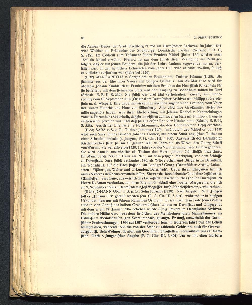(II33) SARA v. S. g. G., Tochter Johanns (1129). Im Codicill des Michel G. von 1550wird auch Sara, feines Bruders Johanns Tochter, mit einem Stück englifchen Tuches zui einer Schauben bedacht (z. Jungen, F. G. Chr. III, f. 400). Ausweislich des Darmftädter