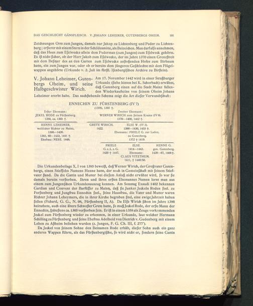 Die Urkundenbeilage X, I von 1385 beweift, daß Werner Wirich, der Großvater Guten-bergs , einen Stieffohn Namens Henne hatte, der noch in Gemeinfchaft mit feinem Stief-vater ftand. Da die Gattin und Mutter bei diefem Anlaß nicht erwähnt wird, fo war pedamals bereits verßorben. Ihren und ihres erßen Ehemannes Namen lernt man auseinem zum Jungenfchen Urkundenauszug kennen. Am Sonntag Exaudi 1402 bekennenGardian und Convent der Barfüßer zu Maint?, daß pe Junker Jeckein Roden feel. zuForßenberg und Jungfrau Ennechin feel., feine Hausfrau, die Vater und Mutter warenRichter Johann Leheymers, die in ihrer Kirche begraben find, eine ewigejahrzeit haltenfüllen (Fichard, G. G., N. 98, Fürftenberg II, A). Da Elfe Wirich (chon im Jahre 1386heirathete, auch eine ältere Schwefter Grete hatte, fo mußJeckelRode, der erfteMann derEnnechin, fpäteßens ca. 1365 verftorben fein. Er ift in einem 1358 als Zeuge vorkommendenJeckel zum Fürftenberg wieder zu erkennen, in einer Urkunde, laut welcher HermannSchilling zu Fürftenberg und feine Ehefrau Adelheid von Dietrich v. Gudenberg mit einemLehen zu Aßheim beliehen wurden (z. Jungen, F. G. Ch. III, f. 277’).