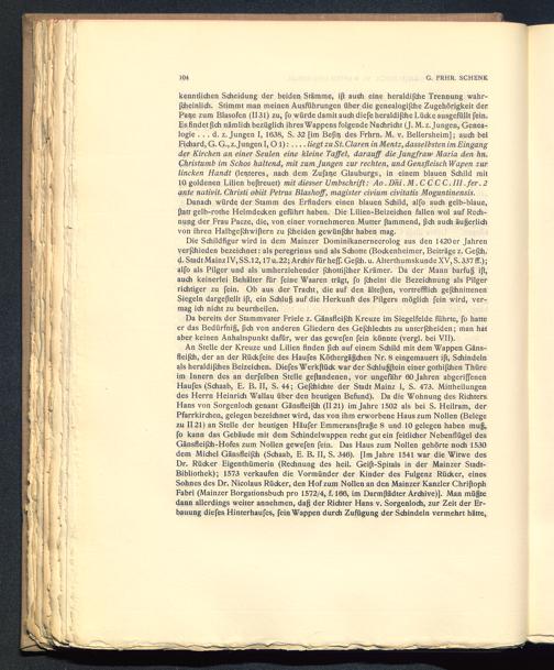 kenntlichen Scheidung der beiden Stämme, iß auch eine heraldifche Trennung wahr-scheinlich. Stimmt man meinen Ausführungen über die genealogißhe Zugehörigkeit derPatje zum Blasofen (1131) zu, fo würde damit auch diefe heraldißhe Lücke ausgefüllt fein.Es findet (ich nämlich bezüglich ihres Wappens folgende Nachricht (J. M.z. Jungen, Genea-logie . . . d. z. Jungen I, 1638, S. 32 [im Beßtj des Frhrn. M. v. Bellersheim]; auch beiFichard, G. G.,z. Jungen 1,01): .... liegt zu St. Clären in Mentz, dasselbsten im Eingangder Kirchen an einer Seulen eine kleine Taffel, darauff die Jungfraw Maria den hn.Christumb im Schos haltend, mit zum Jungen zur rechten, und Gensfleisch Wapen zurlincken Handt (letzteres, nach dem Zufatje Glauburgs, in einem blauen Schild mit10 goldenen Lilien beßreuet) mit diesser Umbschrift: Ao . Dhi. M. C C C C. III .fer . 2ante nativit. Christi obiit Petrus Blashoff, magister civium civitatis Moguntinensis.