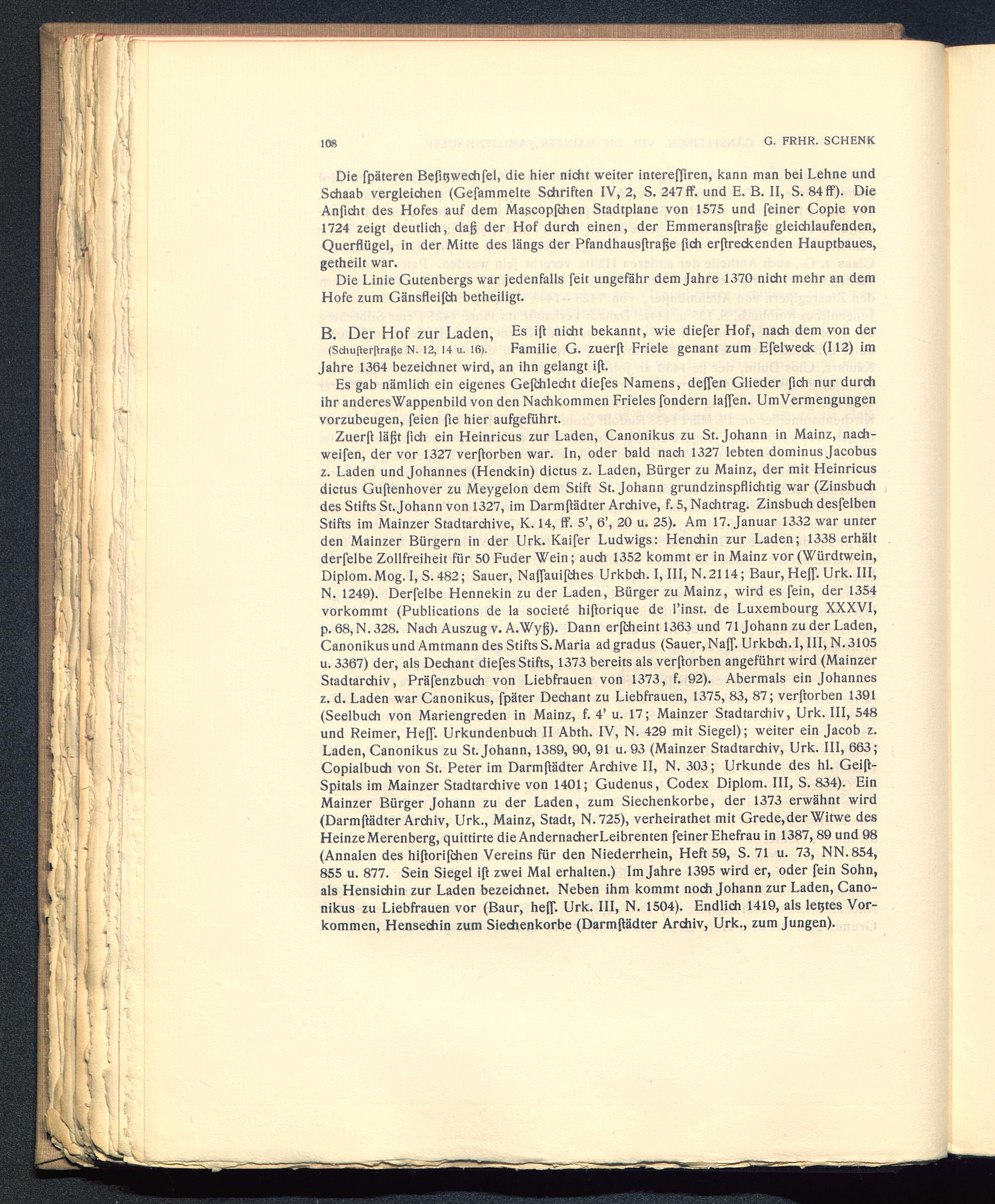 B. Der Hof zur Laden, Es ig nicht bekannt, wie diefer Hof, nach dem von der(Schu(ier(iraße N. 12, 14 u. 16). Familie G. zuerg Friele genant zum Efelweck (112) imJahre 1364 bezeichnet wird, an ihn gelangt ift.