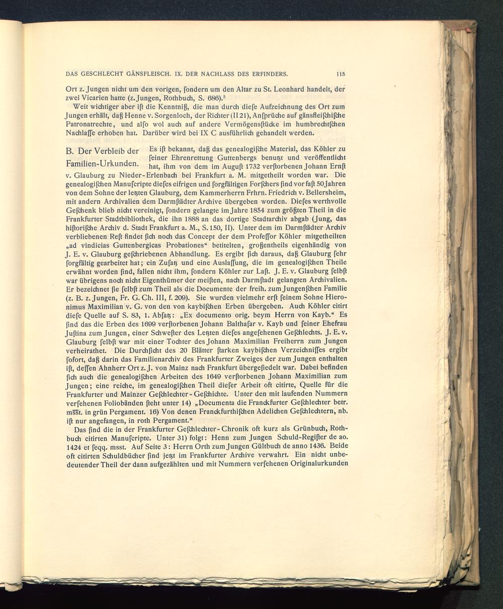 feiner Ehrenrettung Guttenbergs benutzt und veröffentlichtFamilien-Urkunden. h atj jh m yon ^em j m Auguß 1732 verdorbenen Johann Ernßv. Glauburg zu Nieder-Erlenbach bei Frankfurt a. M. mitgetheilt worden war. Diegenealogißhen Manufcripte diefes eifrigen und forgfältigen Forßhers find vor faft 50jahrenvon dem Sohne der lebten Glauburg , dem Kammerherrn Frhrn. Friedrich v. Bellersheim,mit andern Archivalien dem Darmftädter Archive übergeben worden. Diefes werthvolleGefchenk blieb nicht vereinigt, fondern gelangte im Jahre 1854 zum größten Theil in dieFrankfurter Stadtbibliothek, die ihn 1888 an das dortige Stadtarchiv abgab (Jung, dashißorifche Archiv d. Stadt Frankfurt a. M., S. 150, II). Unter dem im Darmßädter Archivverbliebenen Reft findet fich noch das Concept der dem Profeffor Köhler mitgetheilten„ad vindicias Guttenbergicas Probationes“ betitelten, großentheils eigenhändig vonJ. E. v. Glauburg gefchriebenen Abhandlung. Es ergibt fich daraus, daß Glauburg fehrforgfältig gearbeitet hat; ein Zufatj und eine Ausladung, die im genealogifchen Theileerwähnt worden find, fallen nicht ihm, fondern Köhler zur Laß. J. E. v. Glauburg felbftwar übrigens noch nicht Eigenthümer der meiften, nach Darmftadt gelangten Archivalien.Er bezeichnet ße felbft zum Theil als die Documente der freih. zum Jungenfchen Familie(z. B. z. Jungen, Fr. G. Ch. III, f. 209). Sie wurden vielmehr erß feinem Sohne Hiero-nimus Maximilian v. G. von den von kaybißhen Erben übergeben. Auch Köhler citirtdiefe Quelle auf S. 83, 1. Abfatj: „Ex documento orig, beym Herrn von Kayb.“ Esfind das die Erben des 1699 verftorbenen Johann Balthafar v. Kayb und feiner EhefrauJußina zum Jungen, einer Schwefter des Leuten diefes angefehenen Gefchlechts. J. E. v.Glauburg felbft war mit einer Tochter des Johann Maximilian Freiherrn zum Jungenverheirathet. Die Durchficht des 20 Blätter ftarken kaybißhen Verzeichniffes ergibtfofort, daß darin das Familienarchiv des Frankfurter Zweiges der zum Jungen enthalteniß, deffen Ahnherr Ort z. J. von Mainz nach Frankfurt übergefiedelt war. Dabei befindenfich auch die genealogißhen Arbeiten des 1649 verftorbenen Johann Maximilian zumJungen; eine reiche, im genealogifchen Theil diefer Arbeit oft citirte, Quelle für dieFrankfurter und Mainzer Geßhlechter-Gefchichte. Unter den mit laufenden Nummernverfehenen Foliobänden fteht unter 14) „Documenta die Franckfurter Geßhlechter betr.msst. in grün Pergament. 16) Von denen Franckfurthifchen Adelichen Gefchlechtern, nb.ift nur angefangen, in roth Pergament.“