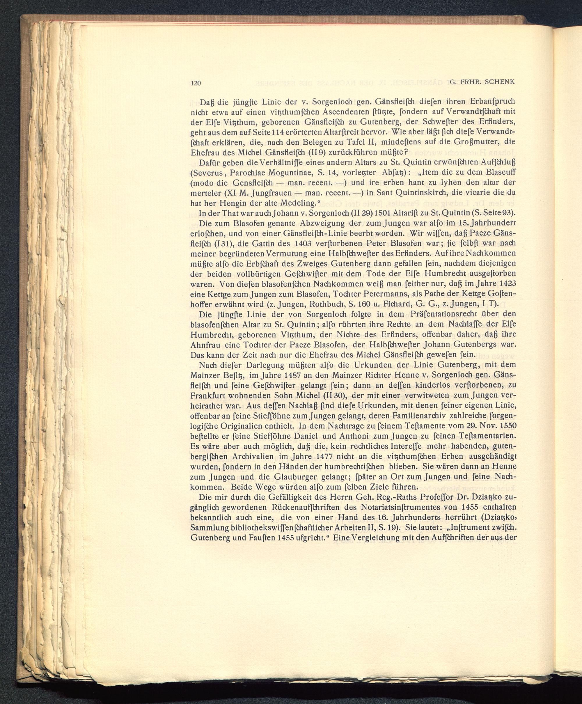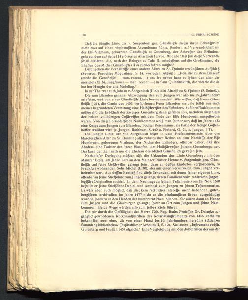Die jüngfte Linie der von Sorgenloch folgte in dem Präfentationsrecht über denblasofenfchen Altar zu St. Quintin; alfo rührten ihre Rechte an dem Nachlaffe der ElfeHumbrecht, geborenen Vitjthum, der Nichte des Erfinders, offenbar daher, dag ihreAhnfrau eine Tochter der Pacze Blasofen, der Halbfchwefter Johann Gutenbergs war.Das kann der Zeit nach nur die Ehefrau des Michel Gänsfleifch gewefen fein.