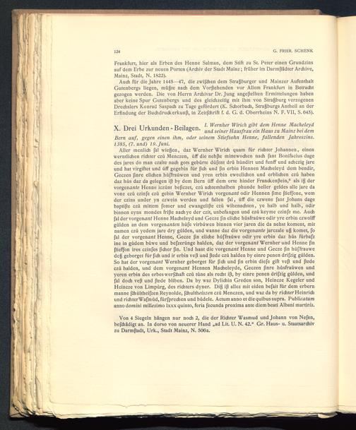 Aller menlich fal wießen, daz Wernher Wirich quam für richter Johannen, einenwerntlichen richter czü Menczen, uff die nehfte mittewochen nach fant Bonifacius dagedes jares do man czalte nach gots gebürte düfent drü hündirt und funflf und achczig jareund hat virgiftet und üff gegebin für {ich und fin erbin Hennen Macheleyd dem bendir,Geczen finre elichen hüffraüwen und yren erbin eweclichen und erblichen czü habendaz hüs daz da gelegen ift by dem Bern üff dem orte hinder Franckenßein, 8 als iß dervorgenaate Henne iczünt beßczet, czü achtemhalben phunde heller geldes alle jare davone czü czinfe czü gebin Wernher Wirich vorgenannt odir Hennen firne ftieffone, wemder czins under yn czwein werden und fallen fal, üff die czwene fant Johans dagebaptiße czü mittem fomer und ewangelifte czü wihenachten, ye halb und halb, odirbinnen eyns mondes frifte nachye der czit, unbefangen und czü keyme czinfe me. Auchfal der vorgenannt Henne Macheleyd und Gecze fin eliche hüsfraüwe odir yre erbin czwolfFgülden an dem vorgenanten hüfe virbüwen binnen vier jaren die da nehst koment, mitnamen czü yedem jare dry gülden, und wanne daz die vorgenante jarczale uß körnet, fofal der vorgenant Henne, Gecze fin eliche hüffraüwe odir yre erbin daz hüs fürbafzine in güdem büwe und befzerünge halden, daz der vorgenant Wernher und Henne finßieffon ires czinfes ficher fin. Und hant die vorgenant Henne und Gecze fin hüffraüwedeß geborget für (ich und ir erbin veft und ßede czü halden by einre penen drifzig gülden.So hat der vorgenant Wernher geborget für fich und fin erbin diefe gift veft und ßedeczü halden, und dem vorgenant Hennen Macheleyde, Geczen finre hüsfraüwen undyeren erbin des erbeswerfchaft czü tüne als recht iß, by einre penen drifzig gülden, undfal doch veß und ftede bliben. Da by waz Dylichin Greden son, Heincze Kegeier undHeincze von Limpürg, des richters dyner. Diß iß allez mit eiden befait für dem erbernmanne fchültheifzen Reynolde, fchulth eiszen czü Menczen, und waz da by richter Heinrichund richterWafmüd, fürfprechen und büdele. Actum anno et die quibus supra. Publicatamanno domini millesimo lxxx quinto, feria fecunda proxima ante diem beati Albani martiris.