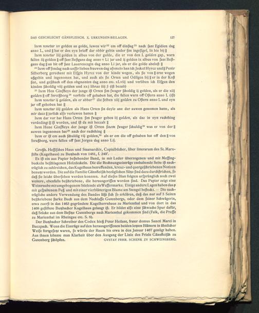 Der Buijbacher Schreiber des Codex hieß Peter Heilant, frater domus Sancti Marci inBuczpach. Wenn die Einträge auf den herausgeriffenen beiden lebten Blättern in ähnlicherWeife fortgefetjt waren, fo würde der Raum bis etwa in den Januar 1467 genügt haben.Aus ihnen könnte man Klarheit über den Ausgang der Linie des Friele Gänsfleifch zuGutenberg fchöpfen. gvstav frhr. schenk zv schweinsberg.