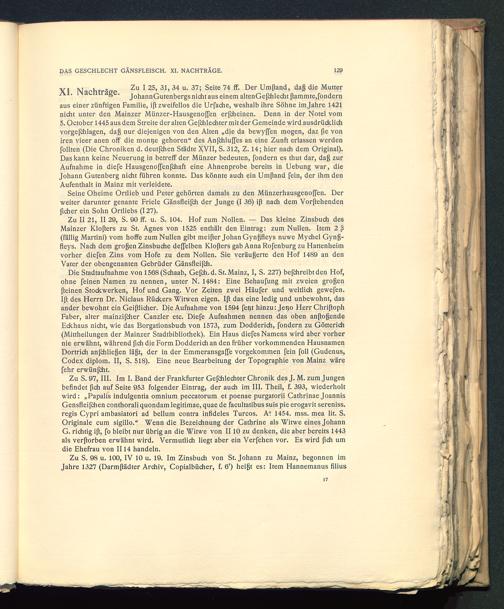 Zu S. 97, III. Im I. Band der Frankfurter GeSchlechter Chronik des J. M. zum Jungenbefindet ßch auf Seite 953 folgender Eintrag, der auch im III. Theil, f. 393, wiederholtwird: „Papalis indulgentia omnium peccatorum et poenae purgatorii Cathrinae JoannisGensfleiSchen conthorali quondam legitimae, quae de facultatibus suis pie erogavit sereniss.regis Cypri ambasiatori ad bellum contra infideles Tureos. A° 1454. mss. mea lit. S.Originale cum sigillo.“ Wenn die Bezeichnung der Cathrine als Witwe eines JohannG. richtig iß, S° bleibt nur übrig an die Witwe von II10 zu denken, die aber bereits 1443als verßorben erwähnt wird. Vermutlich liegt aber ein VerSehen vor. Es wird ßch umdie Ehefrau von II14 handeln.