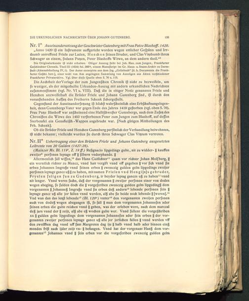 Gegenftand der Auseinanderfetjung ift höchft wahrfcheinlich eineErbfchaftsangelegen-heit, denn Gutenbergs Vater war gegen Ende des Jahres 1419 geworben (vgl. oben S. 76).Frau Patje Blashoff war anfcheinend eine Halbfchwefter Gutenbergs, nach dem Zufat? desChroniften die Witwe des 1403 verftorbenen Peter zum Jungen zum Blashoff, auf deffenSterbetafel ein Gensfleißh -Wappen angebracht war. [Nach gütigen Mittheilungen desFrh. Schenk].