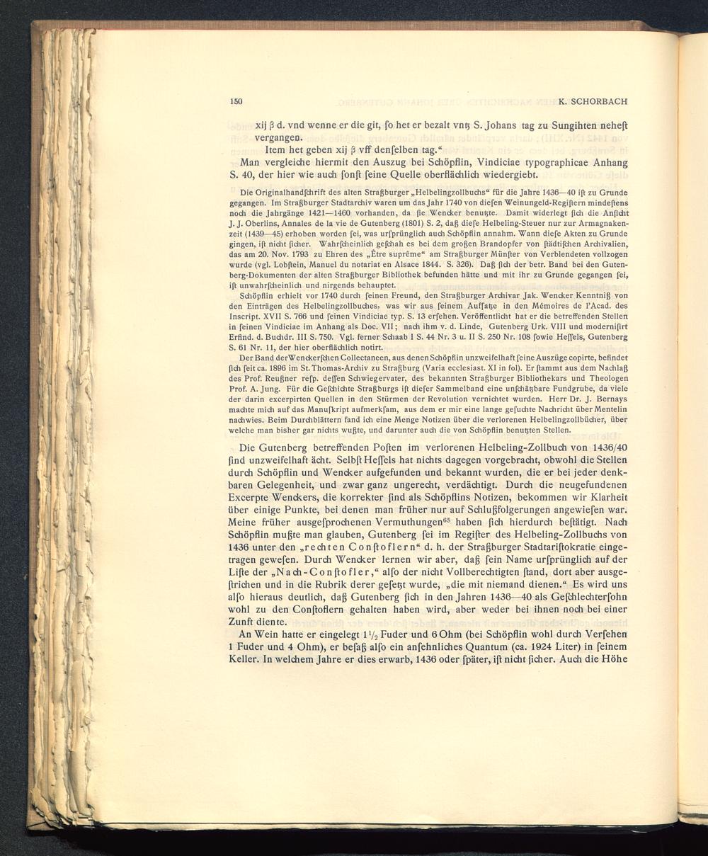 Die Gutenberg betreffenden Poften im verlorenen Helbeling-Zollbuch von 1436/40find unzweifelhaft acht. Selbft Heffels hat nichts dagegen vorgebracht, obwohl die Stellendurch Schöpflin und Wendcer aufgefunden und bekannt wurden, die er bei jeder denk-baren Gelegenheit, und zwar ganz ungerecht, verdächtigt. Durch die neugefundenenExcerpte Wendcers, die korrekter find als Schöpflins Notizen, bekommen wir Klarheitüber einige Punkte, bei denen man früher nur auf Schlußfolgerungen angewiefen war.Meine früher ausgefprochenen Vermuthungen 65 haben fich hierdurch betätigt. NachSchöpflin mußte man glauben, Gutenberg fei im Regifter des Helbeling-Zollbuchs von1436 unter den „rechten Conßoflern“ d. h. der Straßburger Stadtariftokratie einge-tragen gewefen. Durch Wencker lernen wir aber, daß fein Name urfprünglich auf derLiße der „Nach-Conßofler,“ alfo der nicht Vollberechtigten ftand, dort aber ausge-ftrichen und in die Rubrik derer gefetjt wurde, „die mit niemand dienen.“ Es wird unsalfo hieraus deutlich, daß Gutenberg fich in den Jahren 1436—40 als Gejchlechterfohnwohl zu den Conßoflern gehalten haben wird, aber weder bei ihnen noch bei einerZunft diente.