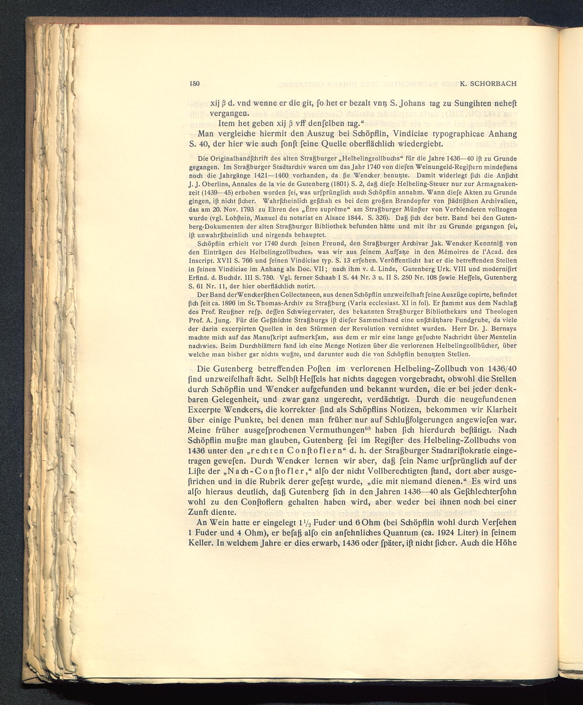 Schöpflin erhielt vor 1740 durch feinen Freund, den Straßburger Archivar Jak. Wendcer Kenntniß vonden Einträgen des Helbelingzollbuches, was wir aus feinem Auffaße in den Memoires de l’Acad. desInscript. XVII S. 766 und feinen Vindiciae typ. S. 13 erfehen. Veröffentlicht hat er die betreffenden Stellenin feinen Vindiciae im Anhang als Doc. VII; nach ihm v. d. Linde, Gutenberg Urk. VIII und modernißrtErfind, d. Buchdr. III S. 750. Vgl. ferner Schaab I S. 44 Nr. 3 u. II S. 250 Nr. 108 fowie Heffels, GutenbergS. 61 Nr. 11, der hier oberflächlich notirt.