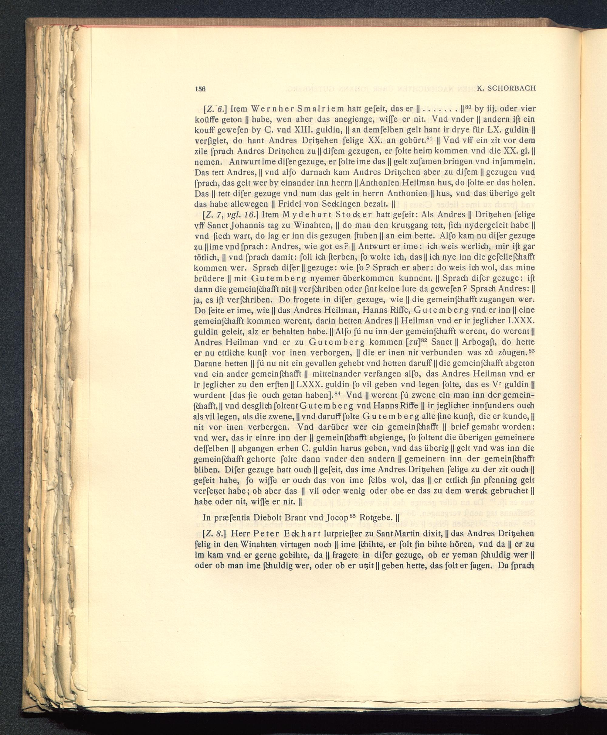 [Z. 7, vgl. 1 6.] Item Mydehart Stöcker hatt gefeit: Als Andres || Dritjehen feligevff Sanct Johannis tag zu Winahten, || do man den krutjgang tett, (Ich nydergeleit habe ||vnd fiech wart, do lag er inn dis gezugen ftuben || an eim bette. Alfo kam nu difer gezugezu || ime vnd fprach: Andres, wie got es? || Antwurt er ime: ich weis werlich, mir i[t gartötlich, || vnd fprach damit: foll ich fterben, fo wolte ich, das || ich nye inn die gefellefchafftkommen wer. Sprach difer || gezuge: wie fo? Sprach er aber: do weis ich wol, das minebrüdere || mit Gutemberg nyemer überkommen kunnent. || Sprach difer gezuge: ifldann die gemeinfchafift nit || verfchriben oder fint keine lute da gewefen? Sprach Andres: ||ja, es ifl verfchriben. Do frogete in difer gezuge, wie || die gemeinfchafift zugangen wer.Do feite er ime, wie || das Andres Heilman, Hanns Rifife, Gutemberg vnd er inn || einegemeinfchafift kommen werent, darin hetten Andres || Heilman vnd er ir jeglicher LXXX.guldin geleit, alz er behalten habe. || Alfo fü nu inn der gemeinfchafift werent, do werent ||Andres Heilman vnd er zu Gutemberg kommen [zu] 82 Sanct || Arbogaft, do hetteer nu ettliche kunfl vor inen verborgen, || die er inen nit verbunden was zü zöugen. 83Darane hetten || fü nu nit ein gevallen gehebt vnd hetten darufif || die gemeinfchafift abgetonvnd ein ander gemeinfehafft || mitteinander verfangen alfo, das Andres Heilman vnd erir jeglicher zu den erften || LXXX. guldin fo vil geben vnd legen folte, das es V c guldin ||wurdent [das fie ouch getan haben]. 84 Vnd |[ werent fü zwene ein man inn der gemein-fehafft, || vnd desglich foltentGutember g vnd Hanns Riffe || ir jeglicher innfunders ouchals vil legen, als die zwene, || vnd darufif folte Gutemberg alle fine kunft, die er künde, ||nit vor inen verbergen. Vnd darüber wer ein gemeinfchafift || brief gemäht worden:vnd wer, das ir einre inn der || gemeinfchafift abgienge, fo foltent die überigen gemeineredeffelben || abgangen erben C. guldin harus geben, vnd das überig || gelt vnd was inn diegemeinfchafift gehörte folte dann vnder den andern || gemeinem inn der gemeinfchafiftbliben. Difer gezuge hatt ouch || gefeit, das ime Andres Driijehen felige zu der zit ouch ||gefeit habe, fo wiffe er ouch das von ime felbs wol, das || er ettlich fin pfenning geltverfetjet habe; ob aber das || vil oder wenig oder obe er das zu dem werde gebruchet ||habe oder nit, wiffe er nit. ||