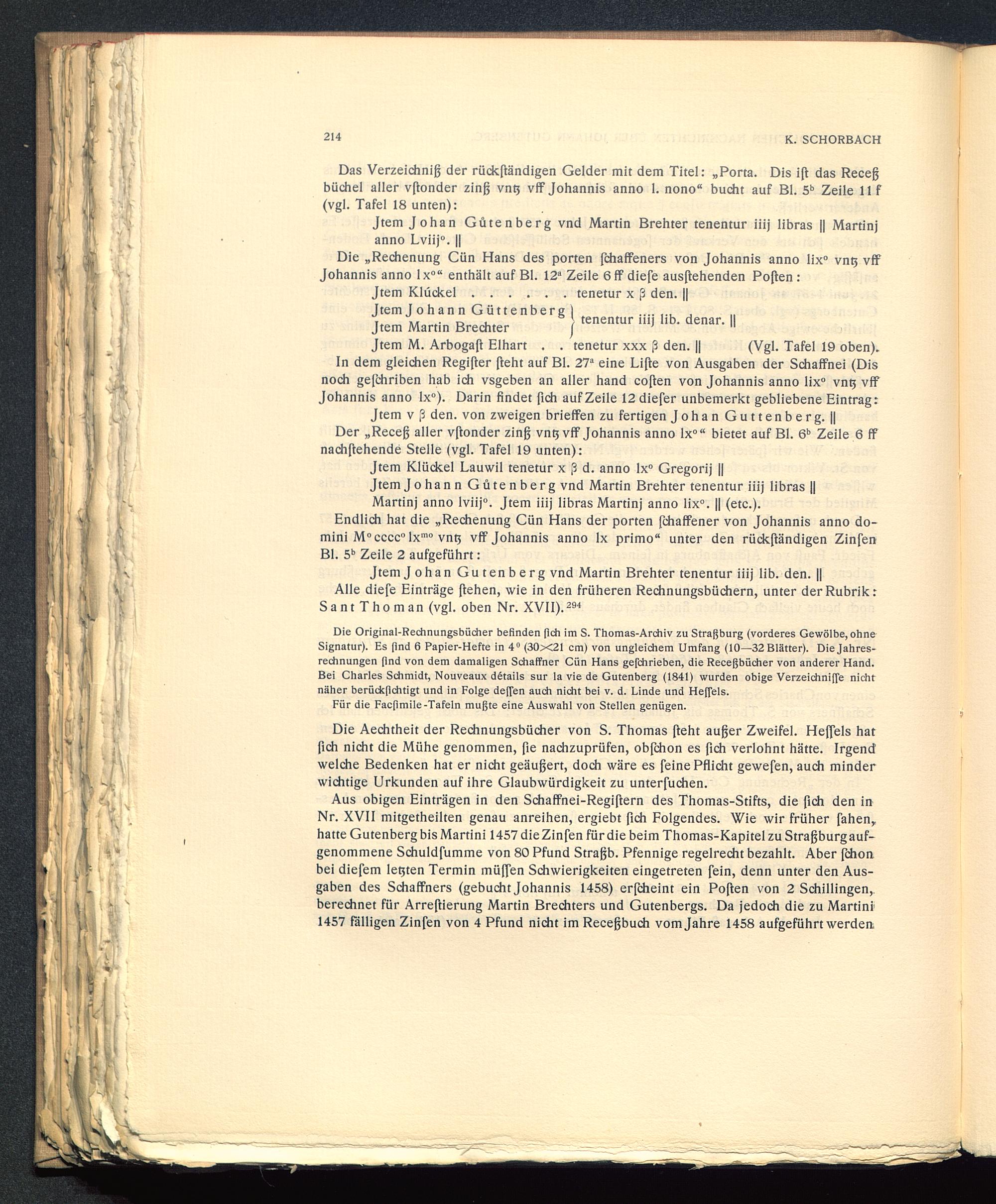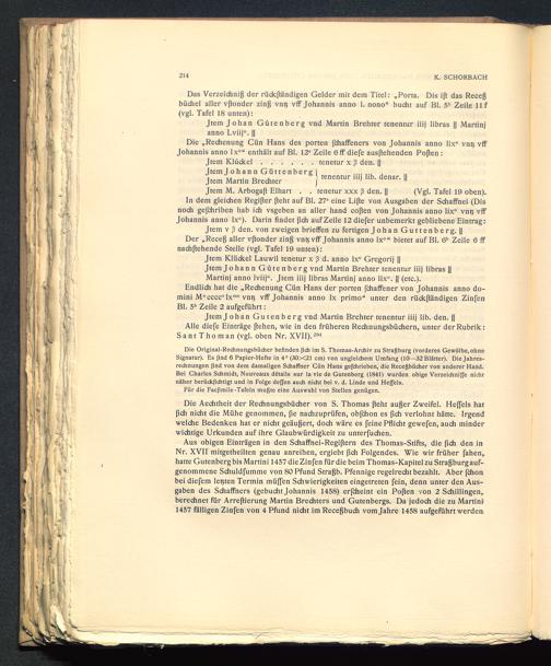 Aus obigen Einträgen in den SchafFnei-Regißern des Thomas-Stifts, die ßch den inNr. XVII mitgetheilten genau anreihen, ergiebt ßch Folgendes. Wie wir früher fahen,hatte Gutenberg bis Martini 1457 die Zinfen für die beim Thomas-Kapitel zu Straßburg auf-genommene Schuldfumme von 80 Pfund Straßb. Pfennige regelrecht bezahlt. Aber [chonbei diefem letzten Termin müffen Schwierigkeiten eingetreten fein, denn unter den Aus-gaben des Schaffners (gebucht Johannis 1458) erfcheint ein Poßen von 2 Schillingen,,beredinet für Arreßierung Martin Brechters und Gutenbergs . Da jedoch die zu Martini 11457 fälligen Zinfen von 4 Pfund nicht im Receßbuch vom Jahre 1458 aufgeführt werden