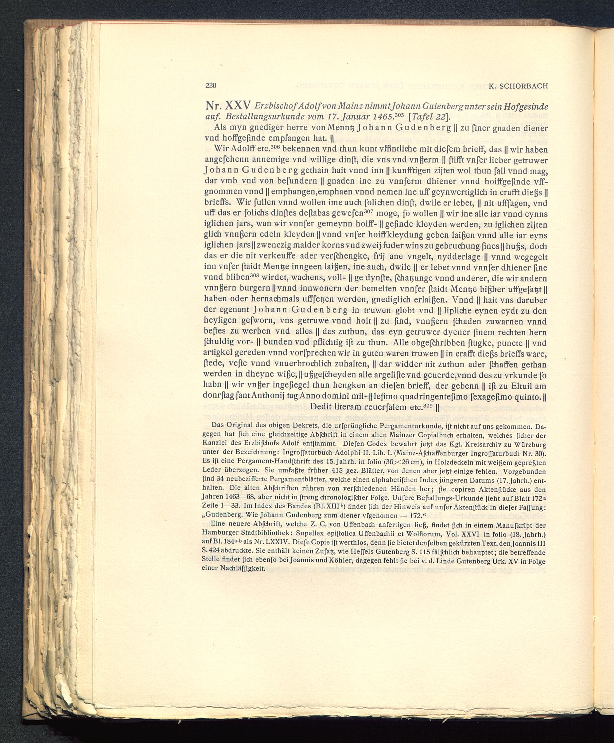 Nr. XXV Erzbischof Adolf von Mainz nimmtjohann Gutenberg unter sein Hofgesindeauf. Bestallungsurkunde vom 17. Januar 1465 . 305 [Tafel 22],