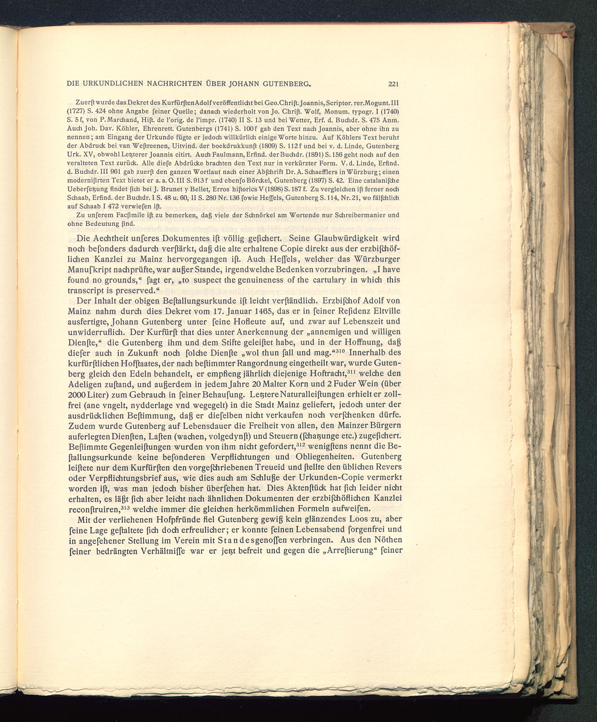 Der Inhalt der obigen Beßallungsurkunde ift leicht verßändlich. Erzbifchof Adolf vonMainz nahm durch dies Dekret vom 17. Januar 1465, das er in feiner Refidenz Eltville ausfertigte, Johann Gutenberg unter feine Hofleute auf, und zwar auf Lebenszeit undunwiderruflich. Der Kurfürß that dies unter Anerkennung der „annemigen und willigenDienße,“ die Gutenberg ihm und dem Stifte geleiftet habe, und in der Hoffnung, dagdiefer auch in Zukunft noch folche Dienfte „wol thun fall und mag.“ 310 Innerhalb deskurfürßlichen Hofftaates, der nach beßimmter Rangordnung eingetheilt war, wurde Guten-berg gleich den Edeln behandelt, er empfieng jährlich diejenige Hoftracht, 311 welche denAdeligen zußand, und außerdem in jedem Jahre 20 Malter Korn und 2 Fuder Wein (über2000 Liter) zum Gebrauch in feiner Behaufung. LeßtereNaturalleißungen erhielt er zoll-frei (ane vngelt, nydderlage vnd wegegelt) in die Stadt Mainz geliefert, jedoch unter derausdrücklichen Beßimmung, dag er diefelben nicht verkaufen noch verfchenken dürfe.Zudem wurde Gutenberg auf Lebensdauer die Freiheit von allen, den Mainzer Bürgernauferlegten Dienßen, Laßen (wachen, volgedynft) und Steuern (jehaßunge etc.) zugeßchert.Beftimmte Gegenleißungen wurden von ihm nicht gefordert, 312 wenigftens nennt die Be-ßallungsurkunde keine befonderen Verpflichtungen und Obliegenheiten. Gutenberg leiftete nur dem Kurfürften den vorgefchriebenen Treueid und ßellte den üblichen Reversoder Verpflichtungsbrief aus, wie dies auch am Schlüge der Urkunden-Copie vermerktworden iß, was man jedoch bisher überfehen hat. Dies Aktenßück hat ßch leider nichterhalten, es läßt ßch aber leicht nach ähnlichen Dokumenten der erzbifchöflichen Kanzleireconftruiren, 313 welche immer die gleichen herkömmlichen Formeln aufweifen.