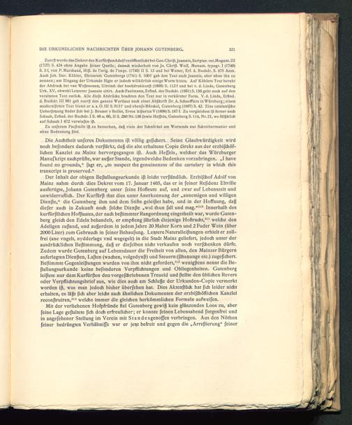 Zuerp wurde das Dekret des KurfürpenAdolf veröffentlicht bei Geo.Chri[LJoannis, Scriptor. rer.Mogunt. III(1727) S. 424 ohne Angabe feiner Quelle; danach wiederholt von Jo. Chrip. Wolf, Monum. typogr. I (1740)S. 5f, von P. Marchand, Hip. de Porig, de l’impr. (1740) II S. 13 und bei Wetter, Erf. d. Buchdr. S. 475 Anm.Auch Joh. Dav. Köhler, Ehrenrett. Gutenbergs (1741) S. lOOf gab den Text nach Joannis, aber ohne ihn zunennen; am Eingang der Urkunde fügte er jedoch willkürlich einige Worte hinzu. Auf Köhlers Text beruhtder Abdrude bei van Wepreenen, Uitvind. der boekdrukkunp (1809) S. 112 f und bei v. d. Linde, GutenbergUrk. XV, obwohl Lenterer Joannis citirt. Auch Faulmann, Erfind, der Buchdr. (1891) S. 156 geht noch auf denveralteten Text zurück. Alle diefe Abdrücke brachten den Text nur in verkürzter Form. V. d. Linde, Erfind,d. Buchdr. III 961 gab zuerp den ganzen Wortlaut nach einer Abfchrift Dr. A. Schaefflers in Würzburg ; einenmoderniprten Text bietet er a. a. O. III S. 913 f und ebenfo Börckel, Gutenberg (1897) S. 42. Eine catalanifcheUeberfeßung findet pch bei J. Brunet y Bellet, Erros hiporics V (1898) S. 187 f. Zu vergleichen ip ferner nochSdiaab, Erfind, der Buchdr. I S. 48 u. 60, II S. 280 Nr. 136 fowie Heffels, Gutenberg S. 114, Nr. 21, wo fälfchlichauf Sdiaab I 472 verwiefen ip.