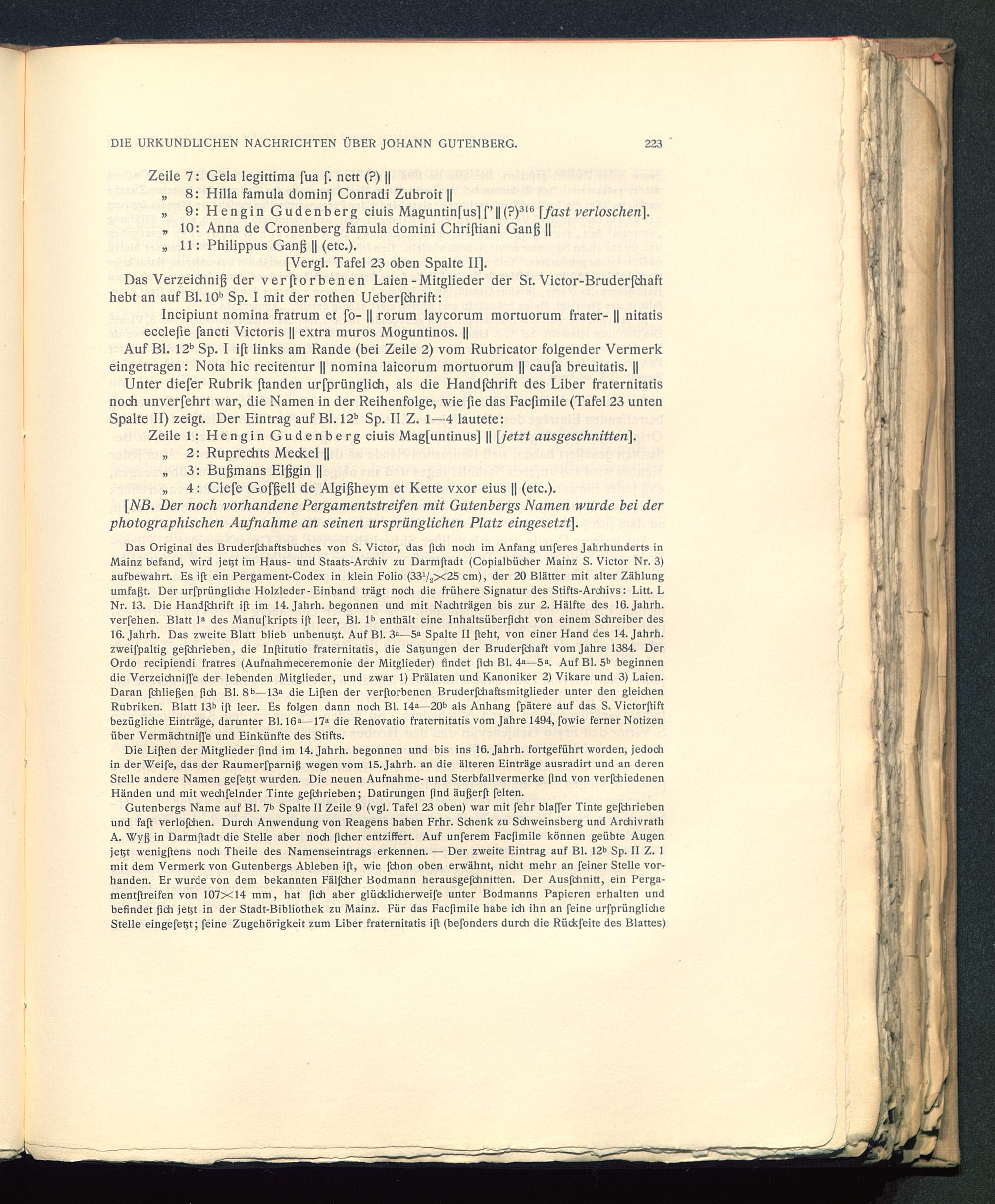 Gutenbergs Name auf Bl. 7 b Spalte II Zeile 9 (vgl. Tafel 23 oben) war mit fehr blaffer Tinte gefchriebenund faß verlofchen. Durch Anwendung von Reagens haben Frhr. Schenk zu Schweinsberg und ArchivrathA. Wyß in Darmßadt die Stelle aber noch ßcher entziffert. Auf unferem Facfimile können geübte Augenjeßt wenigßens noch Theile des Namenseintrags erkennen. — Der zweite Eintrag auf Bl. 12 b Sp. II Z. 1mit dem Vermerk von Gutenbergs Ableben iß, wie fchon oben erwähnt, nicht mehr an feiner Stelle vor-handen. Er wurde von dem bekannten Fälfcher Bodmann herausgefchnitten. Der Ausfchnitt, ein Perga-mentßreifen von 107x14 mm, hat ßch aber glücklicherweife unter Bodmanns Papieren erhalten undbefindet ßch jeßt in der Stadt-Bibliothek zu Mainz . Für das Facfimile habe ich ihn an feine urfprünglicheStelle eingefeßt; feine Zugehörigkeit zum Liber fraternitatis iß (befonders durch die Rückfeite des Blattes)
