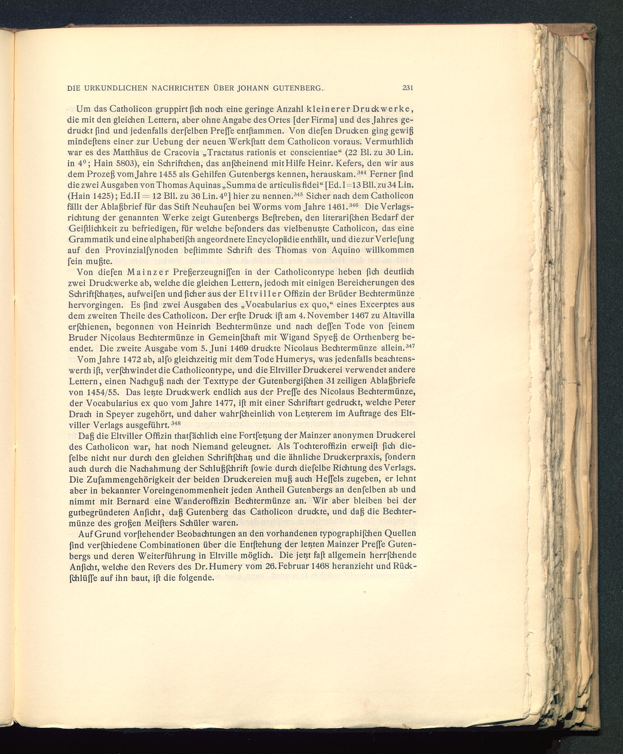 Vom Jahre 1472 ab, alfo gleichzeitig mit dem Tode Humerys, was jedenfalls beachtens-werthift, verfchwindet die Catholicontype, und die Eltviller Druckerei verwendet andereLettern, einen Nachguß nach der Texttype der Gutenbergifchen 31zeiligen Ablaßbriefevon 1454/55. Das letzte Druckwerk endlich aus der Preffe des Nicolaus Bechtermünze,der Vocabularius ex quo vom Jahre 1477, ift mit einer Schriftart gedruckt, welche PeterDrach in Speyer zugehört, und daher wahrfcheinlich von Lenterem im Aufträge des Elt-viller Verlags ausgeführt. 348