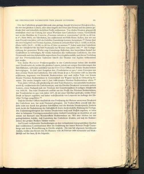 Um das Catholicon gruppirtßch noch eine geringe Anzahl kleinerer Drudewerke,die mit den gleichen Lettern, aber ohne Angabe des Ortes [der Firma] und des Jahres ge-druckt find und jedenfalls derfelben Preffe entftammen. Von diefen Drucken ging gewißmindeßens einer zur Uebung der neuen Werkftatt dem Catholicon voraus. Vermuthlichwar es des Matthäus de Cracovia „Tractatus rationis et conscientiae“ (22 Bl. zu 30 Lin.in 4°; Hain 5803), ein Schriftchen, das anfeheinend mit Hilfe Heinr. Kefers, den wir ausdem Prozeß vom Jahre 1455 als Gehilfen Gutenbergs kennen, herauskam. 344 Ferner finddie zwei Ausgaben von Thomas Aquinas „Summa de articulis fidei“ [Ed. 1=13 Bll. zu 34 Lin.(Hain 1425); Ed.II = 12 Bll. zu 36 Lin.4°] hier zu nennen. 345 Sicher nach dem Catholiconfällt der Ablaßbrief für das Stift Neuhaufen bei Worms vom Jahre 1461. 346 Die Verlags-richtung der genannten Werke zeigt Gutenbergs Beftreben, den literarifdien Bedarf derGeiftlichkeit zu befriedigen, für welche befonders das vielbenutjte Catholicon, das eineGrammatik und eine alphabeti fch angeordnete Encyclopädie enthält, und diezurVerlefungauf den Provinzialfynoden beftimmte Schrift des Thomas von Aquino willkommenfein mußte.