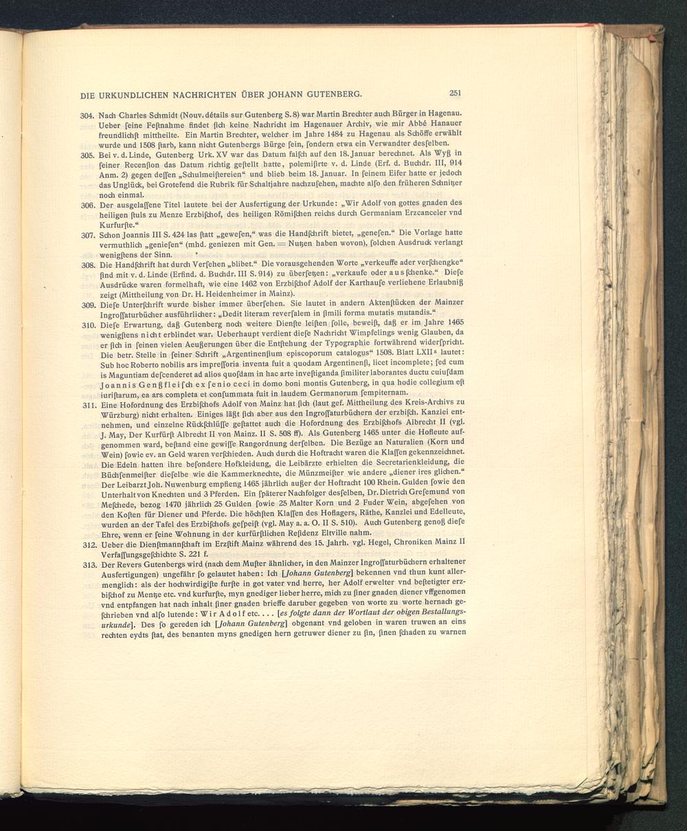 310. Diefe Erwartung, daß Gutenberg noch weitere Dienße leißen folle, beweiß, daß er im Jahre 1465wenigßens nicht erblindet war. Ueberhaupt verdient diefe Nachricht Wimpfelings wenig Glauben, daer ßch in feinen vielen Aeußerungen über die Entßehung der Typographie fortwährend widerfpricht.Die betr. Stelle in feiner Schrift „Argentinenßum episcoporum catalogus“ 1508. Blatt LXII a lautet:Sub hoc Roberto nobilis ars imprefforia inventa fuit a quodam Argentinenß, licet incomplete; fed cumis Maguntiam defcenderet ad alios quofdam in hac arte inveßiganda ßmiliter laborantes ductu cuiufdamJoannis Genßfleifch ex fenio ceci in domo boni montis Gutenberg, in qua hodie collegium eßiurißarum, ea ars completa et confummata fuit in laudem Germanorum fempiternam.