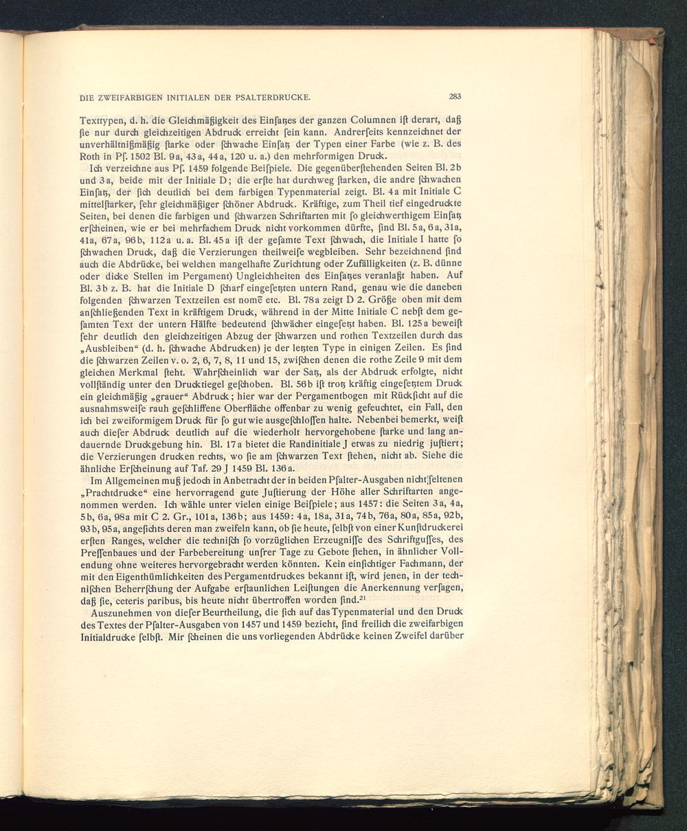 Im Allgemeinen muß jedoch in Anbetracht der in beiden Pfalter-Ausgaben nichtjfeltenen„Prachtdrucke“ eine hervorragend gute Juftierung der Höhe aller Schriftarten ange-nommen werden. Ich wähle unter vielen einige Beifpiele; aus 1457: die Seiten 3a, 4a,5b, 6a, 98a mit C 2. Gr., 101a, 136b; aus 1459: 4a, 18a, 31a, 74b, 76a, 80a, 85a, 92b,93 b, 95a, angeßchts deren man zweifeln kann, ob ße heute, felbft von einer Kunßdruckereierßen Ranges, welcher die technifch fo vorzüglichen Erzeugniffe des Schriftguffes, desPrejfenbaues und der Farbebereitung unfrer Tage zu Gebote ßehen, in ähnlicher Voll-endung ohne weiteres hervorgebracht werden könnten. Kein einßchtiger Fachmann, dermit den Eigenthümlichkeiten des Pergamentdruckes bekannt iß, wird jenen, in der tech-nifchen Beherrjchung der Aufgabe erßaunlichen Leiftungen die Anerkennung verfagen,daß ße, ceteris paribus, bis heute nicht übertroffen worden find. 21