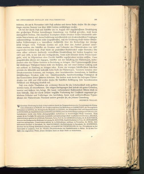 Daß trotj diefer Thatfachen ein evidenter Beweis für die Urheberfchaft nicht geführtwerden kann, ift einzuräumen. Die obigen Darlegungen find jedoch mit guten Gründen,innerer und äußerer Art, belegt. Mit kaum verkennbarer Beßimmtheit führen diefe zudem Schluffe, daß der durch feltfam tragifche Verkettung der Umßände ungenannt ge-bliebene Erfinder und Vollbringer des herrlichen, heute noch unübertroffenen Typen-fcha^es der Pfalterdrucke Niemand anders gewefen fei, als Johann Gutenberg .