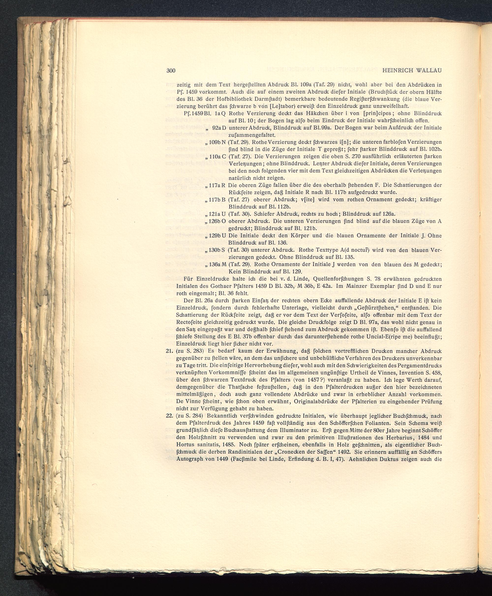 21. (zu S. 283) Es bedarf kaum der Erwähnung, daß folchen vortrefflichen Drucken mancher Abdruckgegenüber zu ftellen wäre, an dem das unfichere und unbehülfliche Verfahren des Druckers unverkennbarzu Tage tritt. Die einfeitige Hervorhebung diefer, wohl auch mit den Schwierigkeiten des Pergamentdrucksverknüpften Vorkommniffe fcheint das im allgemeinen ungünftige Urtheil de Vinnes, Invention S. 458,über den fchwarzen Textdruck des Pfalters (von 1457?) veranlaßt zu haben. Ich lege Werth darauf,demgegenüber die Thatfache feflzuflellen, daß in den Pfalterdrucken außer den hier bezeichnetenmittelmäßigen, doch auch ganz vollendete Abdrücke und zwar in erheblicher Anzahl Vorkommen.De Vinne fcheint, wie fchon oben erwähnt, Originalabdrücke der Pfalterien zu eingehender Prüfungnicht zur Verfügung gehabt zu haben.