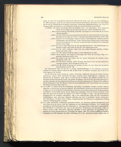 22. (zu S. 284) Bekanntlich verfchwinden gedruckte Initialen, wie überhaupt jeglicher Buchfchmuck, nachdem Pfalterdruck des Jahres 1459 faft vollfländig aus den Schöfferfchen Folianten. Sein Schema weiftgrundfäßlich diefe Buchausftattung dem Illuminator zu. Erft gegen Mitte der 80er Jahre beginnt Schöffer den Holzfchnitt zu verwenden und zwar zu den primitiven Illuftrationen des Herbarius, 1484 undHortus sanitatis, 1485. Noch fpäter erfcheinen, ebenfalls in Holz gefchnitten, als eigentlicher Buch-fchmuck die derben Randinitialen der „Cronecken der Saffen“ 1492. Sie erinnern auffällig an SchöffersAutograph von 1449 (Facflmile bei Linde, Erfindung d. B. I, 47). Aehnlichen Duktus zeigen auch die