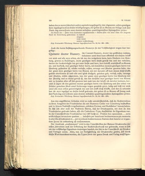 Der Ausdruck „confummare“ wird in den Unter[chriften der Mainzer Druckwerke dererßen Jahrzehnte nach der Erfindung der Buchdruckerkunß nur gebraucht, wenn es ßchum das vollßändige Eigenthum desjenigen handelt, der ßch in der Unterßhrift als Druckerund Verleger nennt. Alles, was zur Fertigftellung der Druckwerke gehört, foll durchdiefes Wort bezeichnet werden, die Typen fowie der ganze Druck und Verlag muß Eigen-